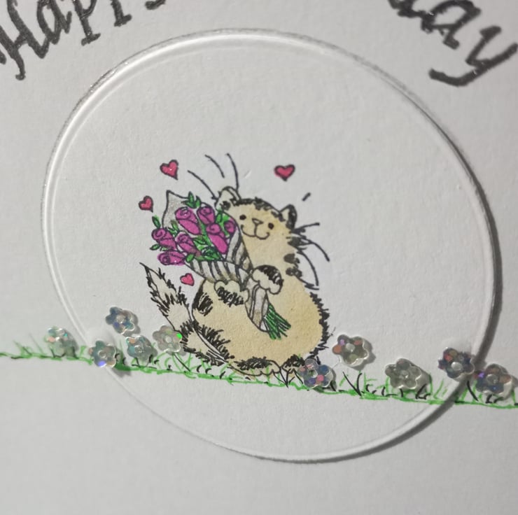 A completely handmade and uniquely designed card. Consisting of a stamped image mounted onto pristine white quality card. Hand coloured. Finished off with flower sequins