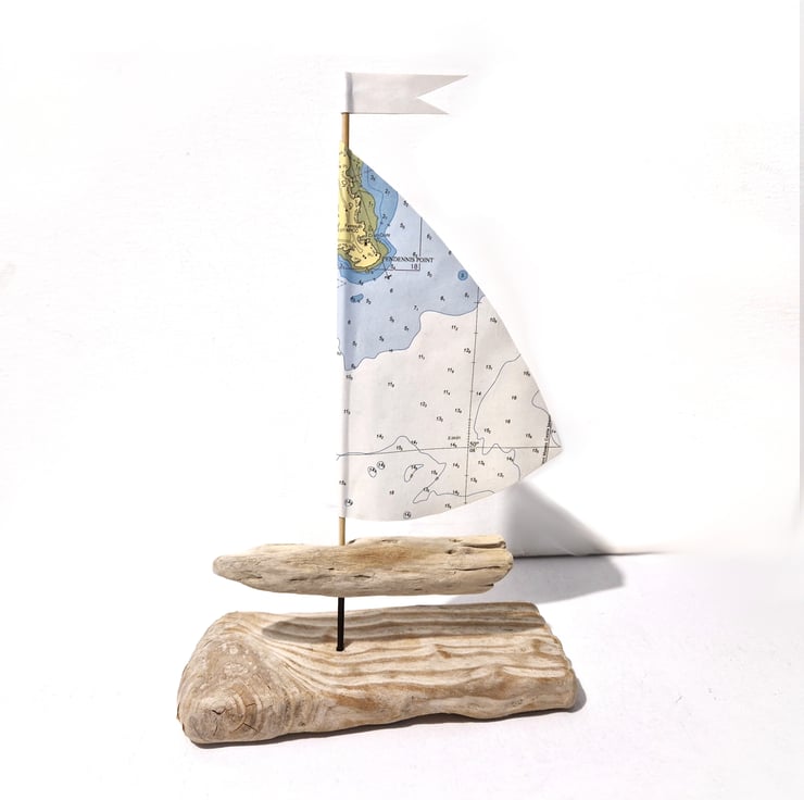 Driftwood sailboat with authentic nautical map sail, from Ship to Shore on Folksy. Other coastal areas are available. The perfect gift for sailors, beachcombers and anyone who loves the sea (or maps!).