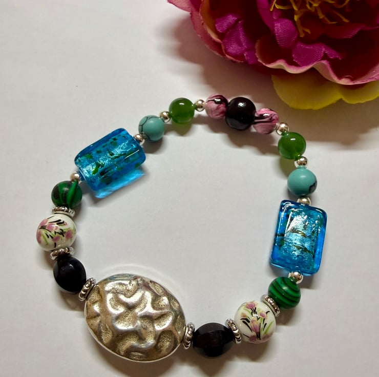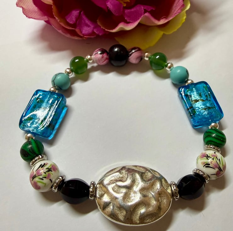 One of a kind Handmade stretch bracelet. This pretty bracelet has a central hammered effect silver coloured metal oval bead with black glass beads either side and beautiful floral design ceramic beads. The rest of this bold bracelet is made up of blue glass rectangle lamp work beads, gemstones and glass with some matching the tones out of the delicate colours in the floral bead. Other accents are Stainless Steel. This would make a great present or why not treat yourself to this one off piece.