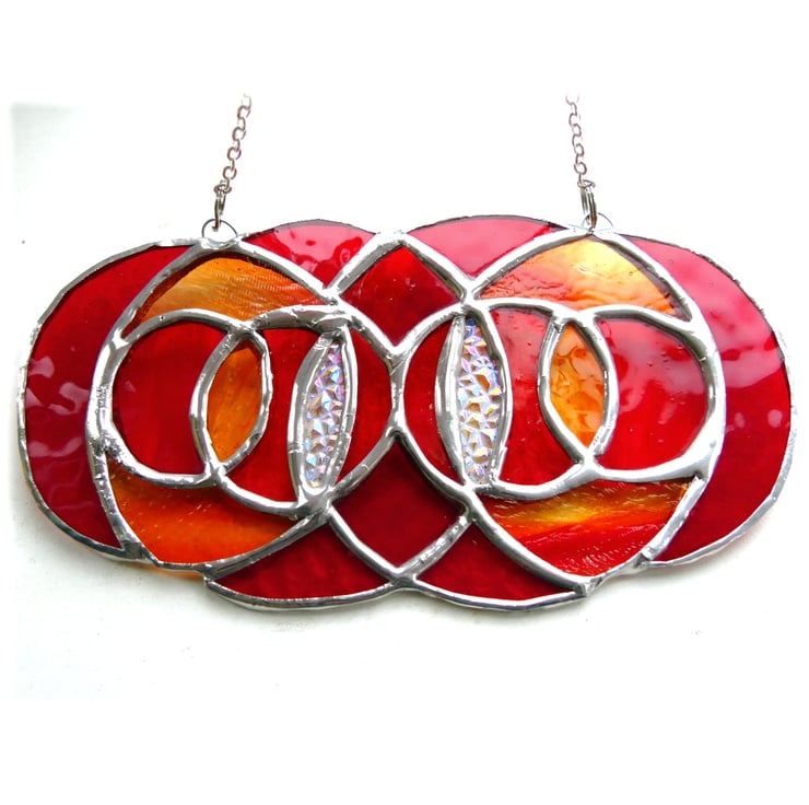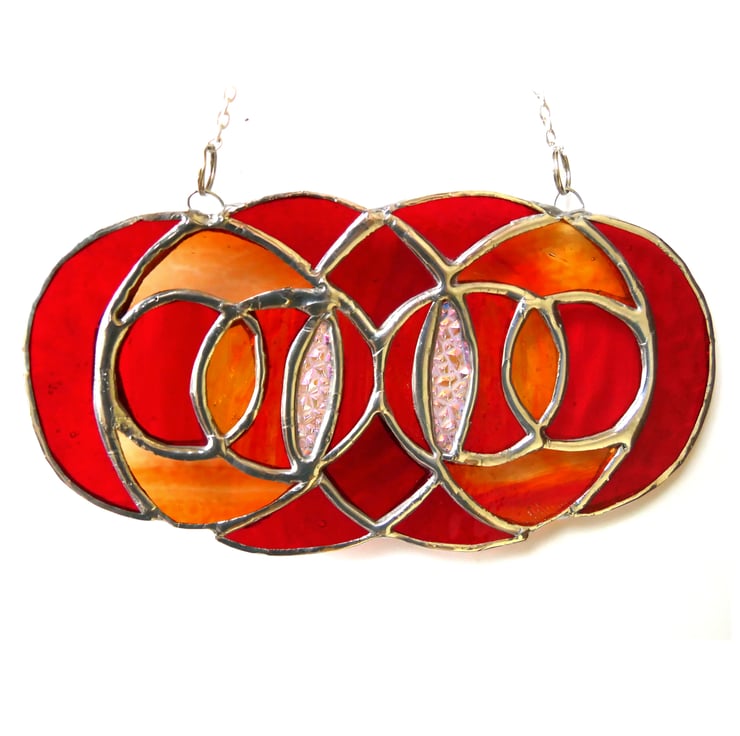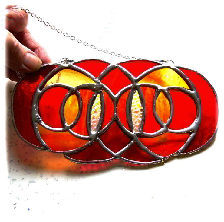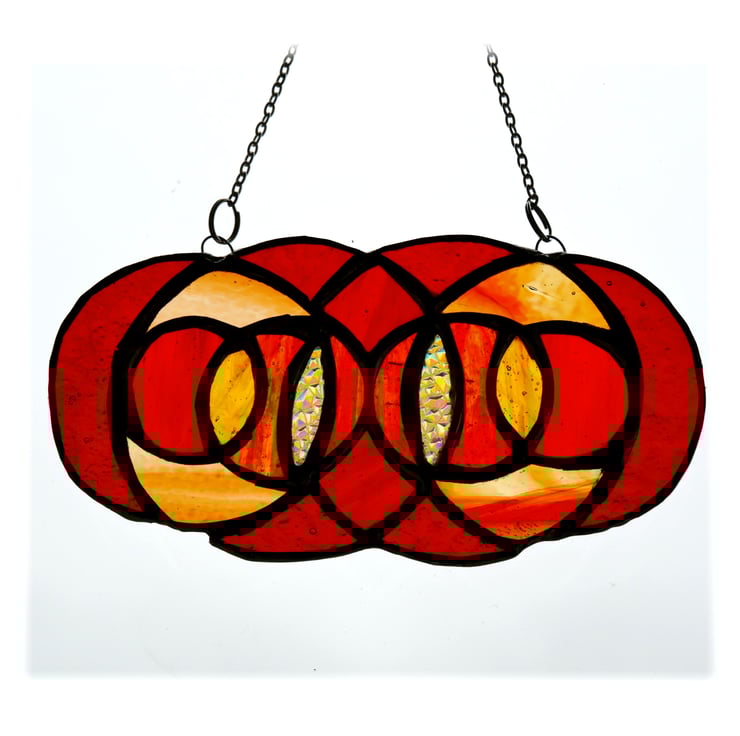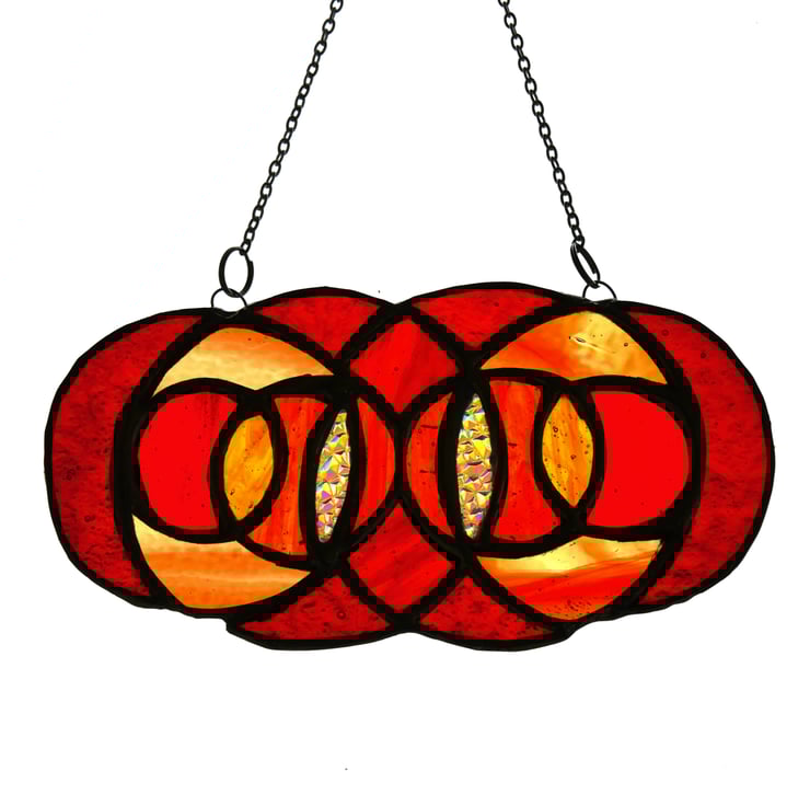 It is cut mainly from gorgeous red and red orange tones of glass with lots of texture which gives movement. The design is based on concentric circles and I have infilled a couple of pieces with precious dichroic glass which gives a super sparkle.