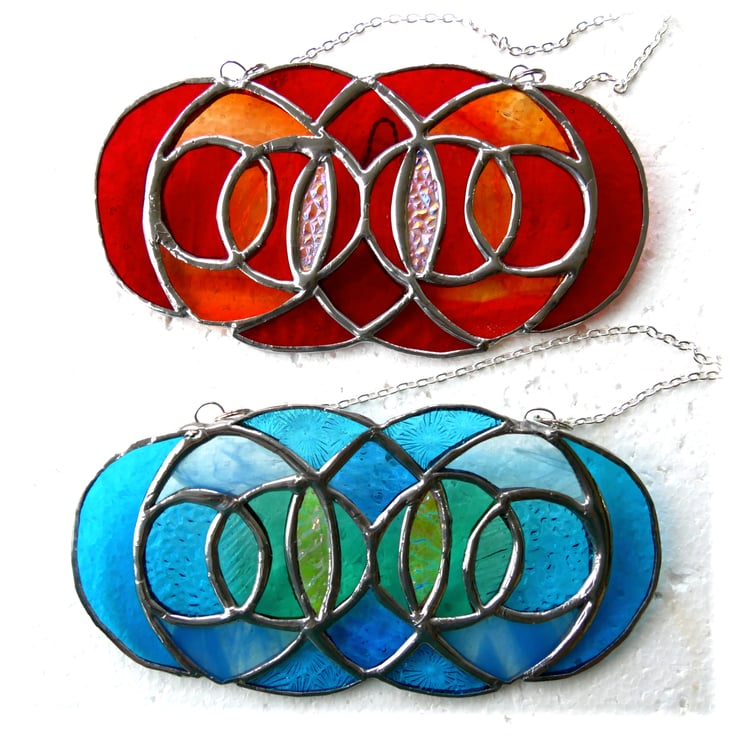 Am really pleased with this vibrant suncatcher. It hangs from a little silvery chain securely attached with solder to the top. It measures 18cm x 8cm.