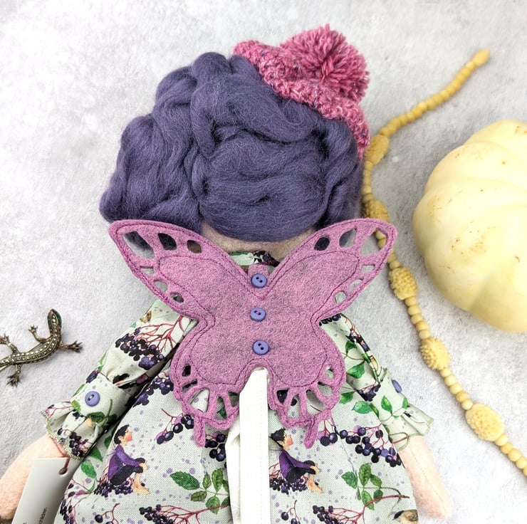 This little doll is Elderberry. She is made from quality wool felt with frosted glass bead eyes and curly berry wool roving for hair. Her facial details are hand embroidered and her hair is hand styled. She is dressed in an Acufactum print cotton called Elder Elf and it features lots of rich autumn elderberries on a mint ground. Her bobble hat is Tweed Felt Rowan Wool.