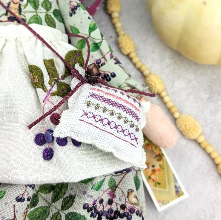 Beneath her dress she has broderie anglais drawers with tiny cotton socks and wool felt boots. Her petticoats are a berry dot cotton with white tulle lace. Her apron is heavily hand embroidered with a folk art pattern of elderberries because she is the Elder Elf She is finished with tiny buttons and a sampler pillow. If you look carefully you can just see a pair of tiny tattered wings too!