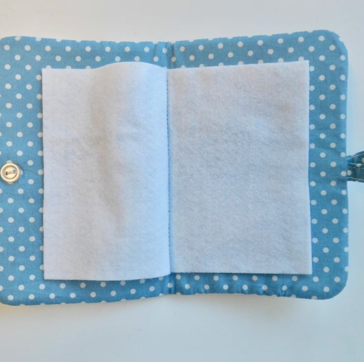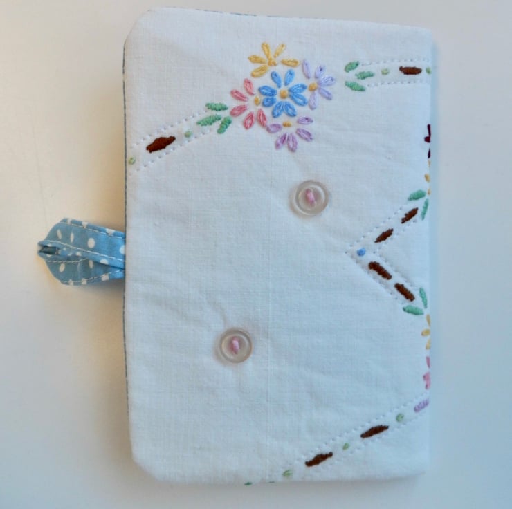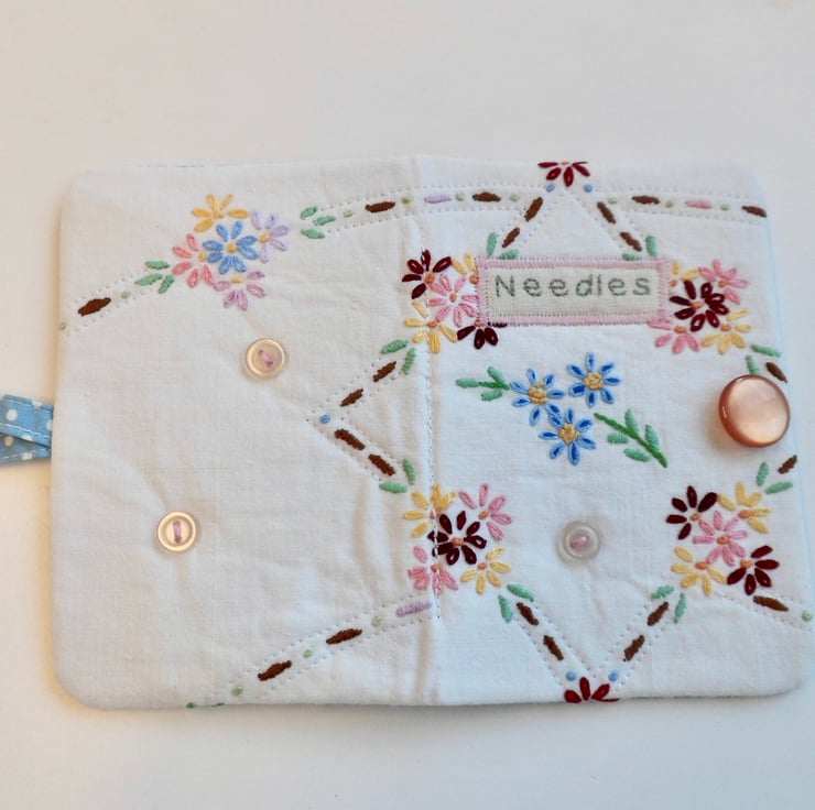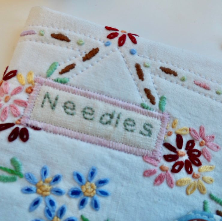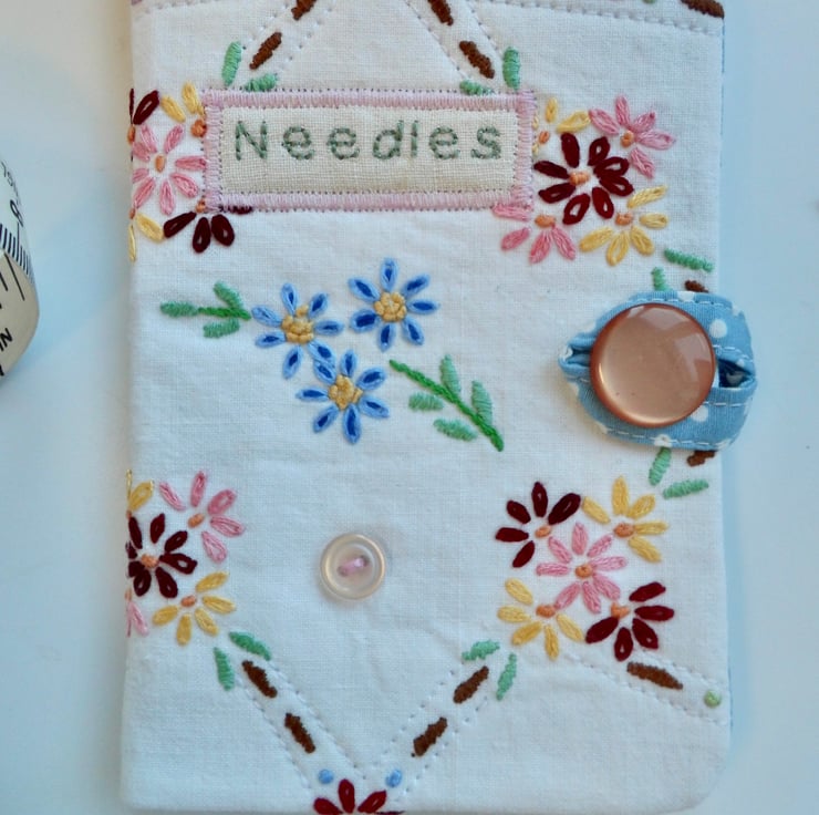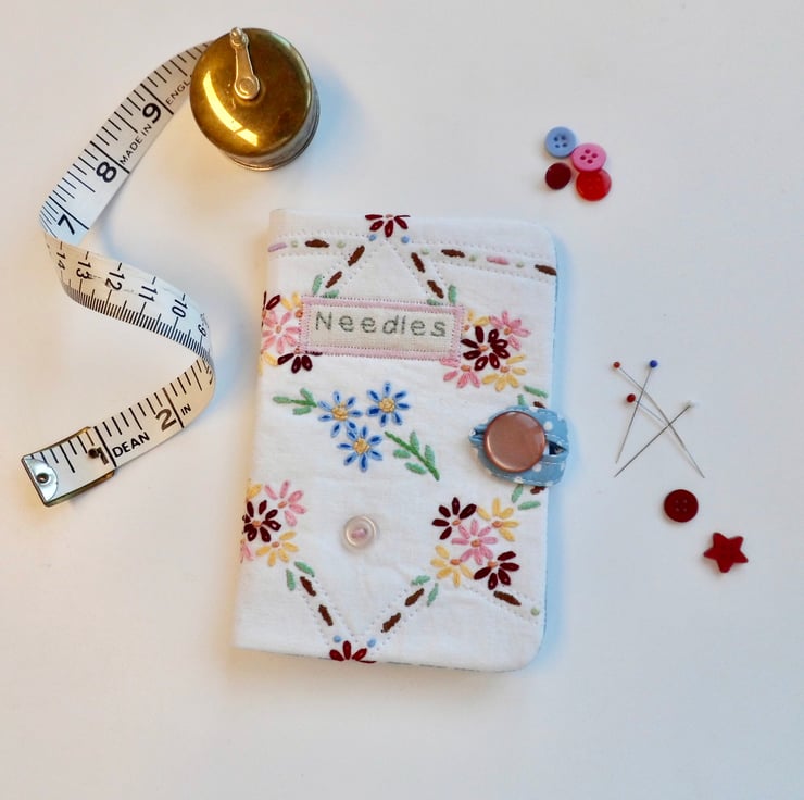Use this little book to keep your sewing needles neat and close at hand. I made the cover using a piece of hand embroidery salvaged from a vintage table cloth. The pretty floral embroidery extends across the reverse of the case too.