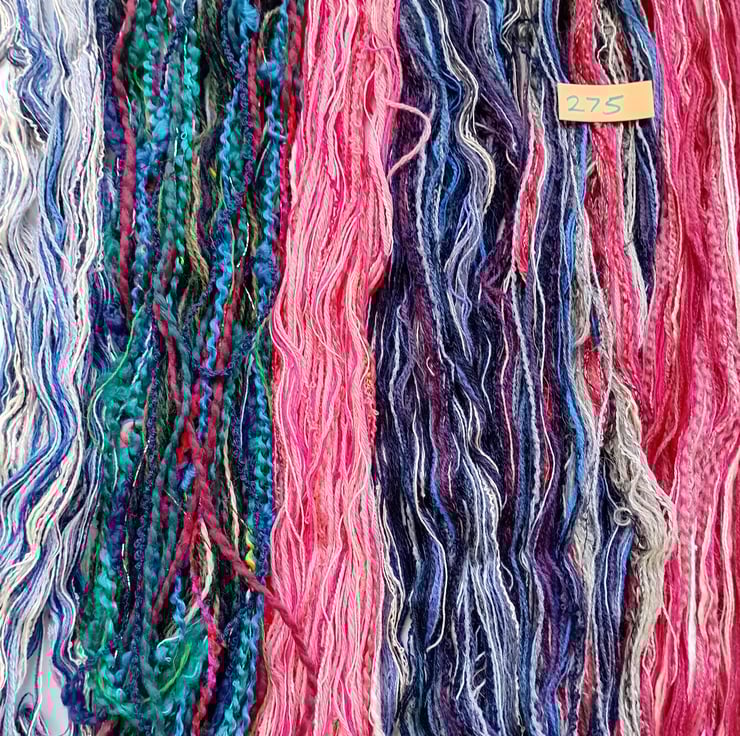 Mixed fibre composition may include lengths of natural yarns - wool, cotton, linen, wool mix, and man made yarns - acrylic, mixed fibre combinations.