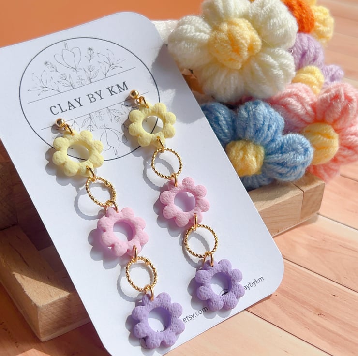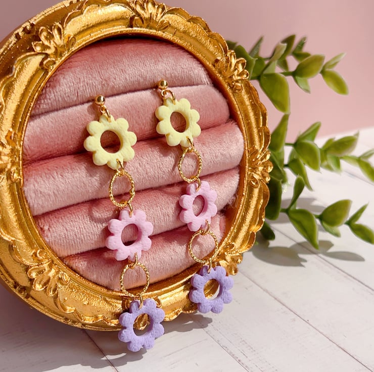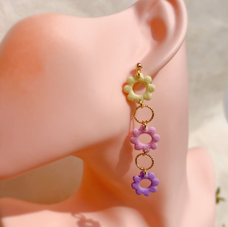 These pastel floral earrings were originally created as an accessory for my cousin’s wedding — I needed something elegant, lightweight and soft in colour. The pastel mix of yellow, pink and lilac felt perfect for a summer celebration, and the gentle movement of the flowers added a lovely, delicate touch.
