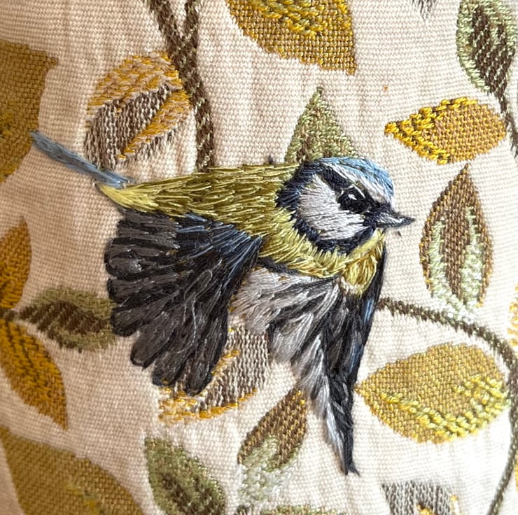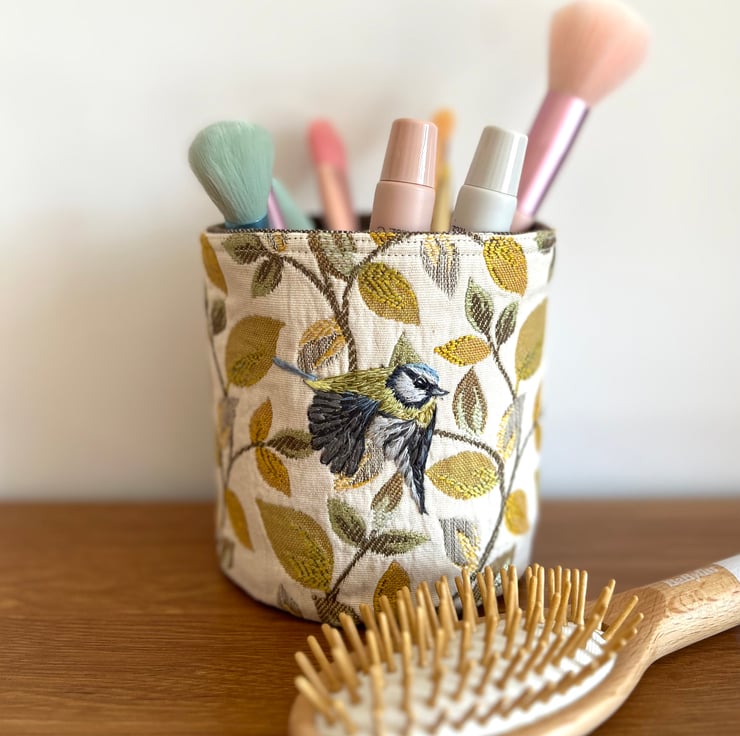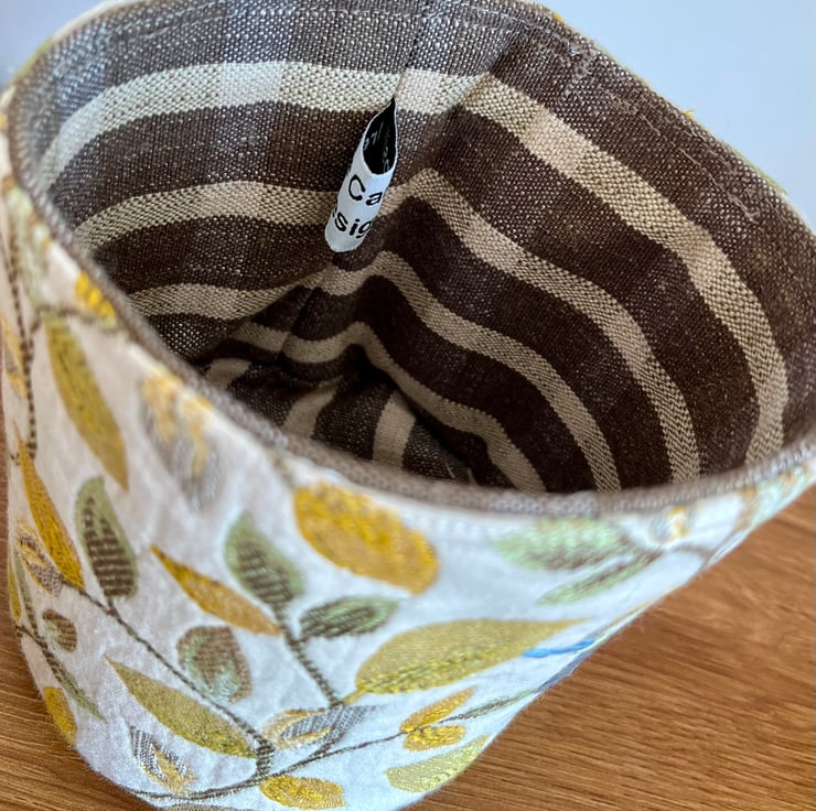 This particular storage pot is made from offcuts of curtain samples of a cream background with a heavy pattern of mustard, yellow and green leaves. Flying in between the foliage is a hand embroidered bluetit.