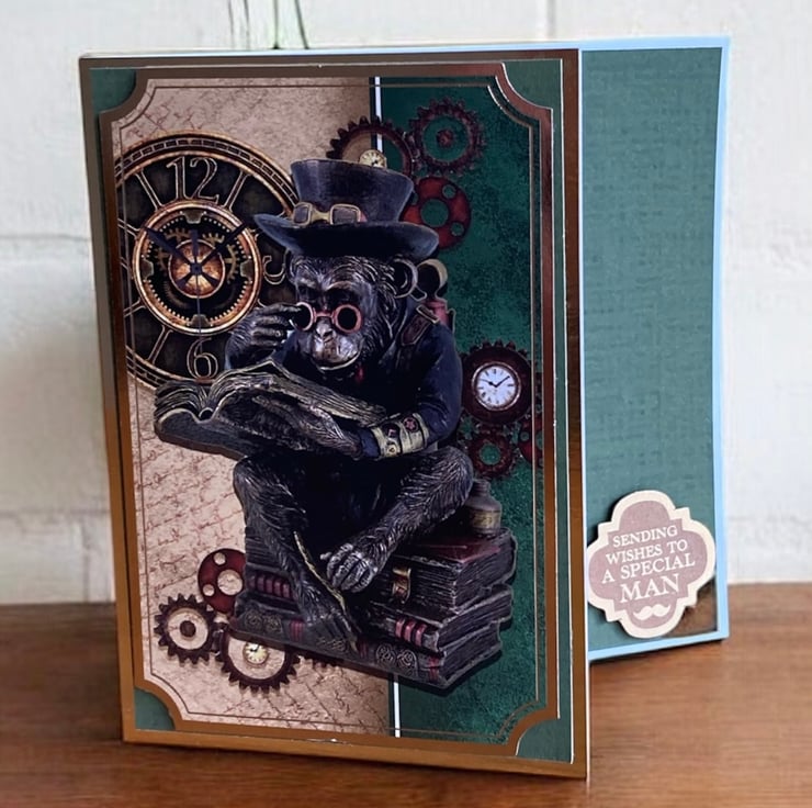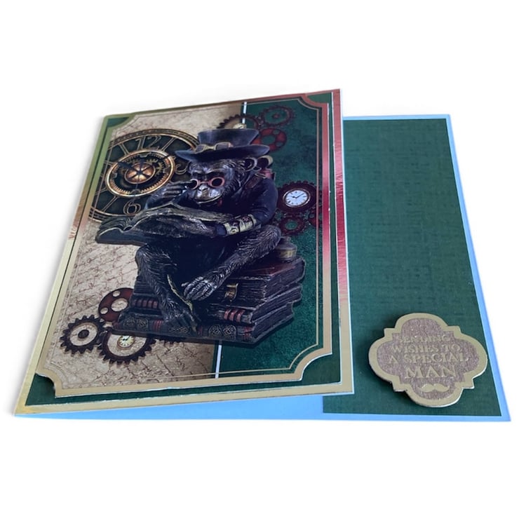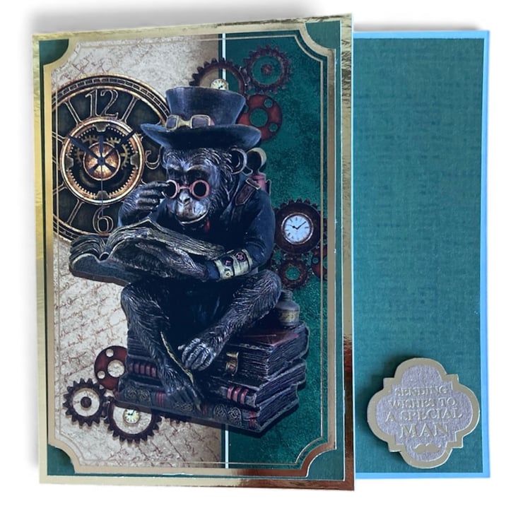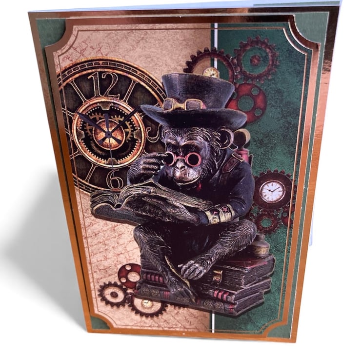 Send a little whimsy and wonder with this charming handmade 5x5 inch card, featuring a dapper chimpanzee perched atop a stack of books, lost in his reading! Dressed in a classic steampunk top hat and set against deep dark green tones with glimmering gold foil, this card is a true keepsake for any gentleman who enjoys a dash of vintage character.