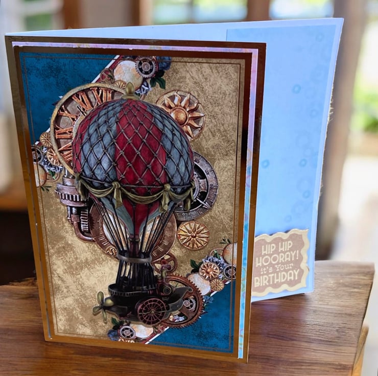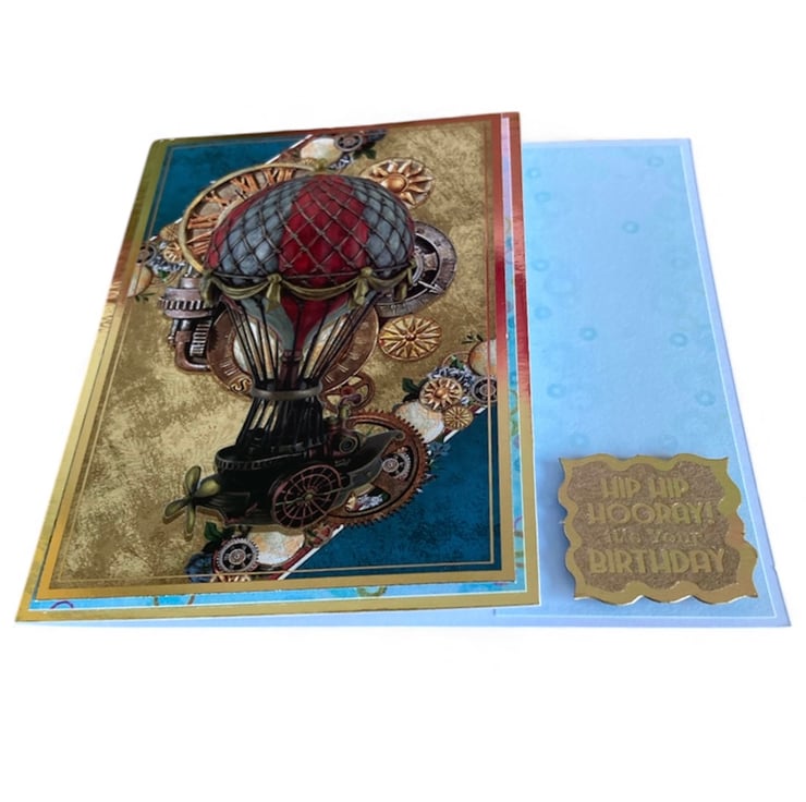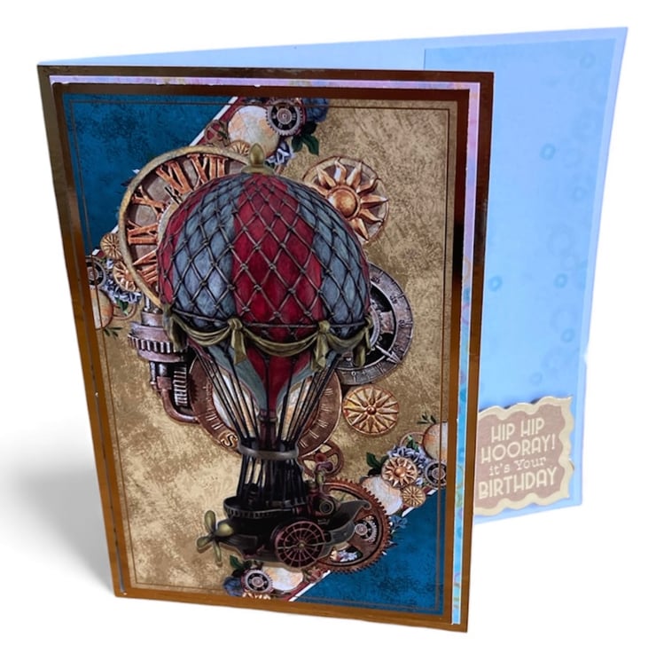 Celebrate in vintage style with this handcrafted steampunk hot air balloon birthday card — a blend of gears, adventure, and golden shimmer!