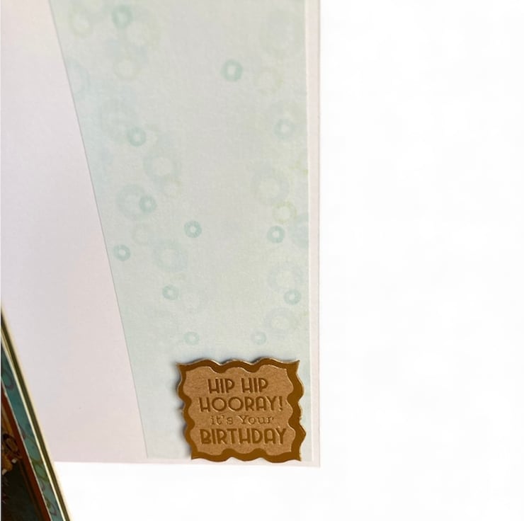 The inside is beautifully decorated with coordinating papers, making it as lovely inside as it is on the outside. Topped with a rustic kraft banner reading “Hip Hip Hurray for Your Birthday”, this card combines old-world charm with handmade warmth — perfect for inventors, and steampunk lovers alike.