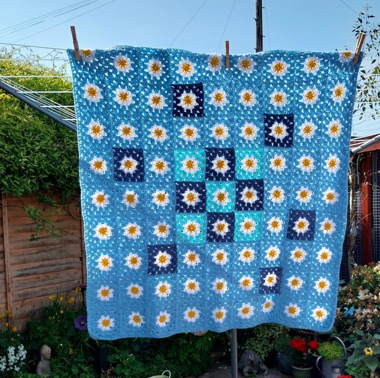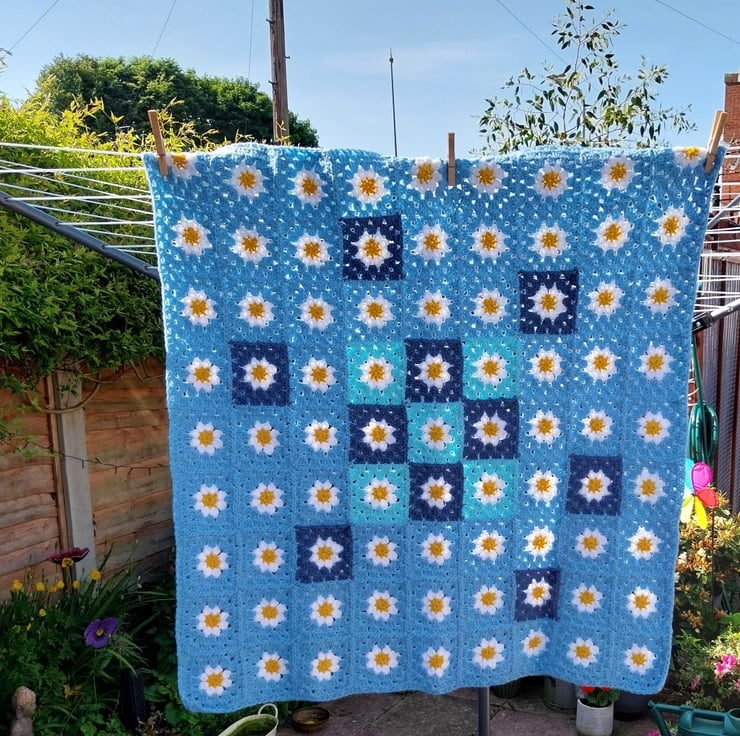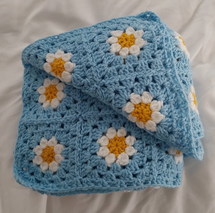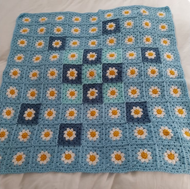 Pretty baby blanket in blue squares with a white daisy with a yellow centre, lovely soft machine washable yarn.
