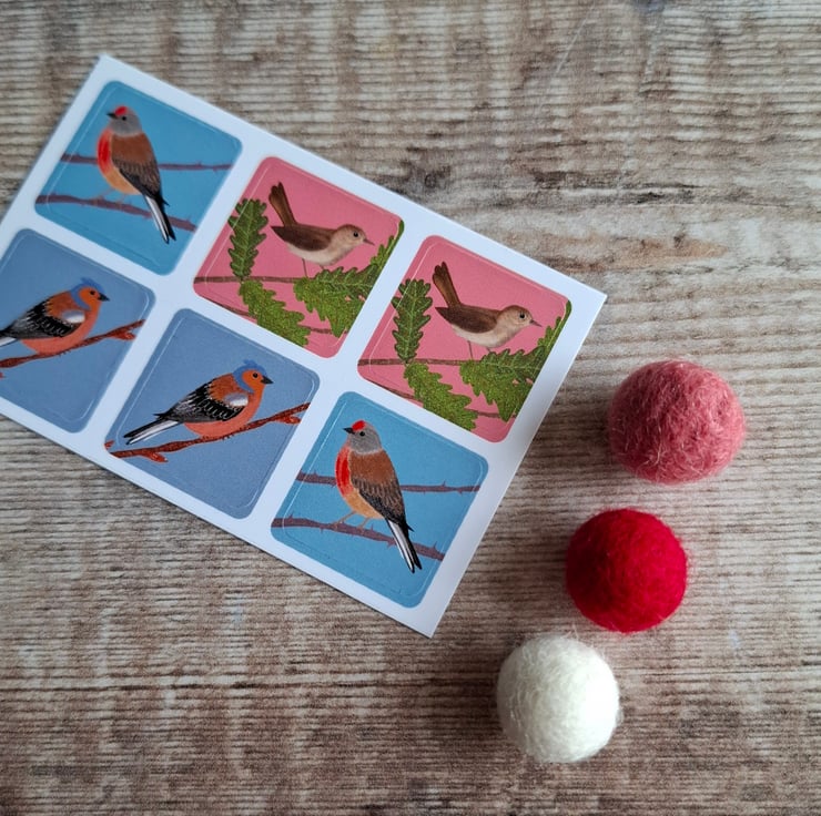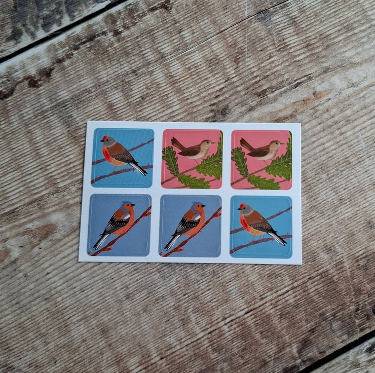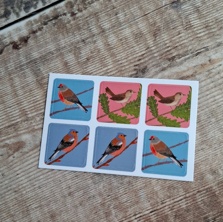 Each set contains six square mini stickers, they are the perfect size to stick on greeting card envelopes and make them extra special. 2 stickers with my nightingale design, 2 stickers with my linnet design and 2 stickers with my chaffinch design.