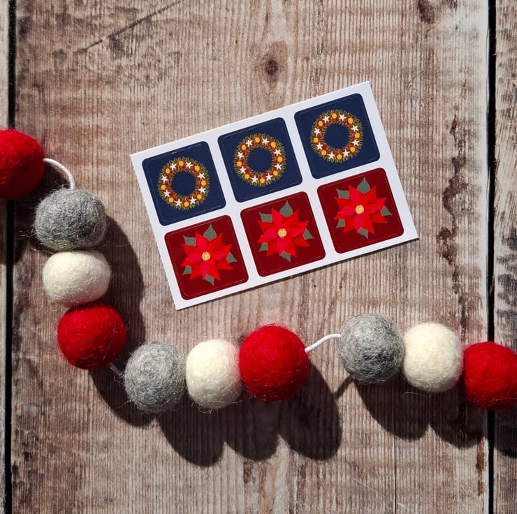 6 stickers, 3 with a poinsettia flower and then 3 with a Christmas wreath.