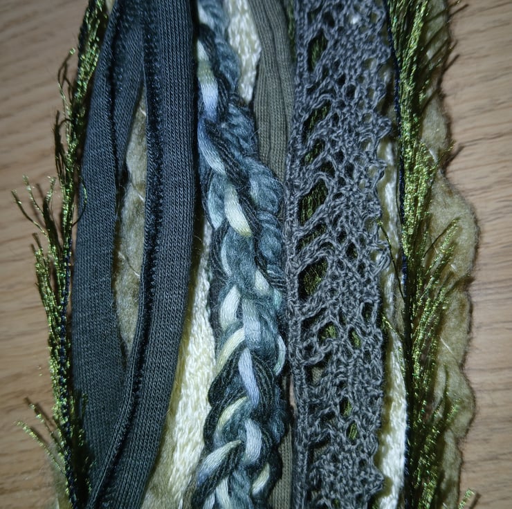 A handmade infinity scarf made using unloved, unwanted and repurposed materials. Festive Pine is for Christmas and beyond. Just pop it over your head, arrange as desired and you are ready to go. Each one is unique, inspred by a Gothic and Boho aesthetic.