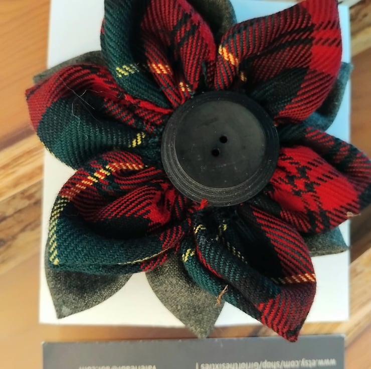 Tartan flower brooch. Two layers of fabric with a button centre and metal pin on the back