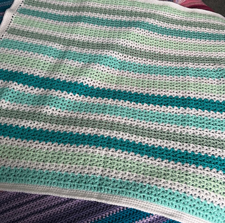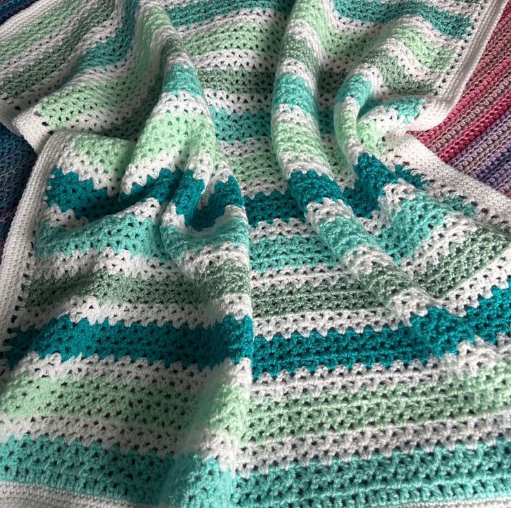 Blanket crocheted in ‘V’ stitch, using greens, turquoise and white. Small blanket perfect for a baby shower gift, Moses basket size.