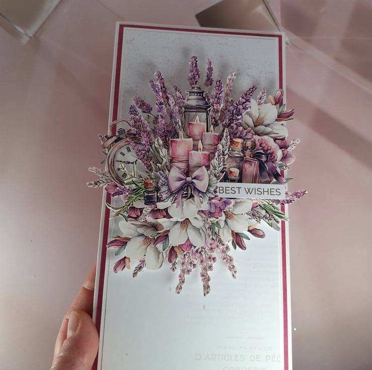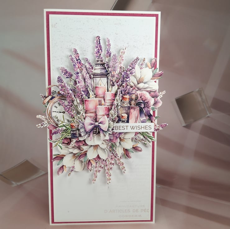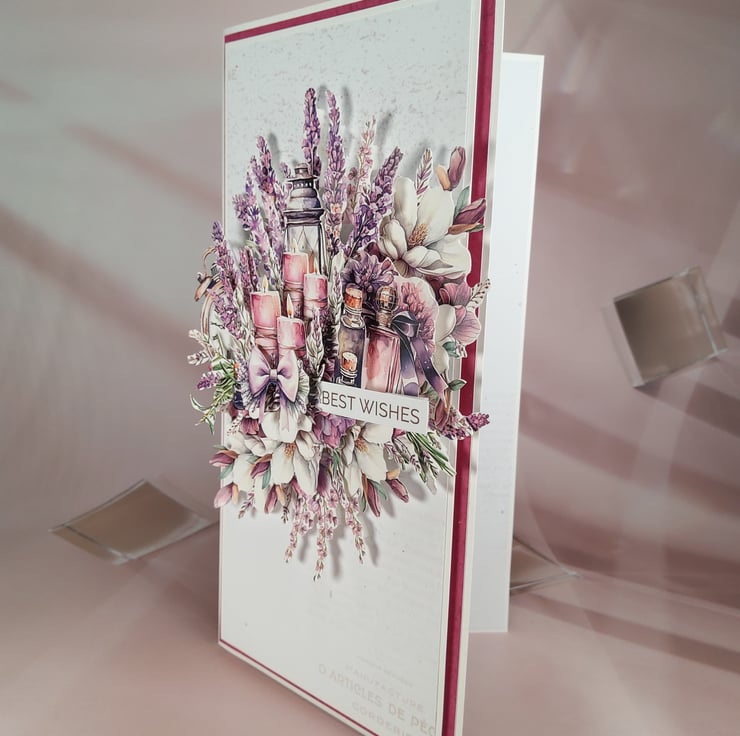 This elegant handmade card features a beautifully layered floral composition in calming shades of lavender, cream and soft pink. At the centre of the design are glowing candles, a lantern and delicate botanical elements, creating a peaceful, romantic atmosphere perfect for many occasions.