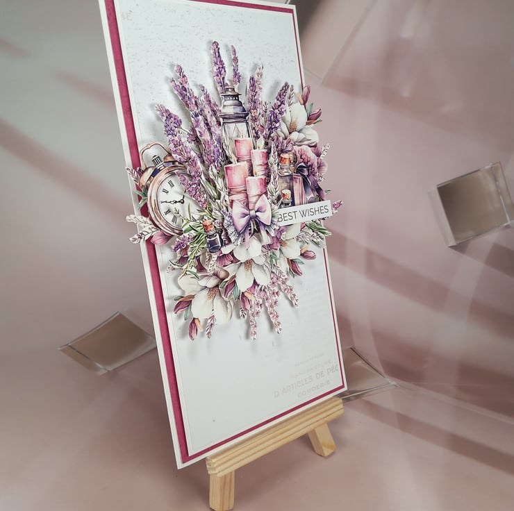 This piece was inspired by calming lavender fields, soft candlelight and romantic floral arrangements. The intention was to create a soothing, elegant card full of warmth and gentle detail.