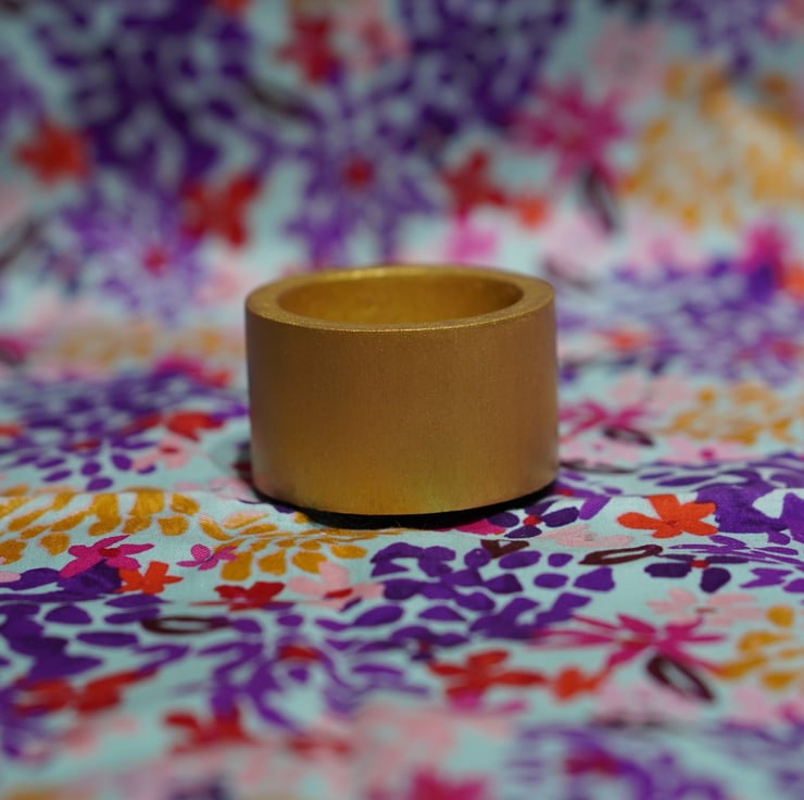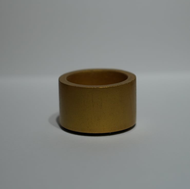 Turned hardwood t light holder size 5cm diameter 3cm tall finished with a gold finish, complete with a felt base to reduce scratching on your surfaces.