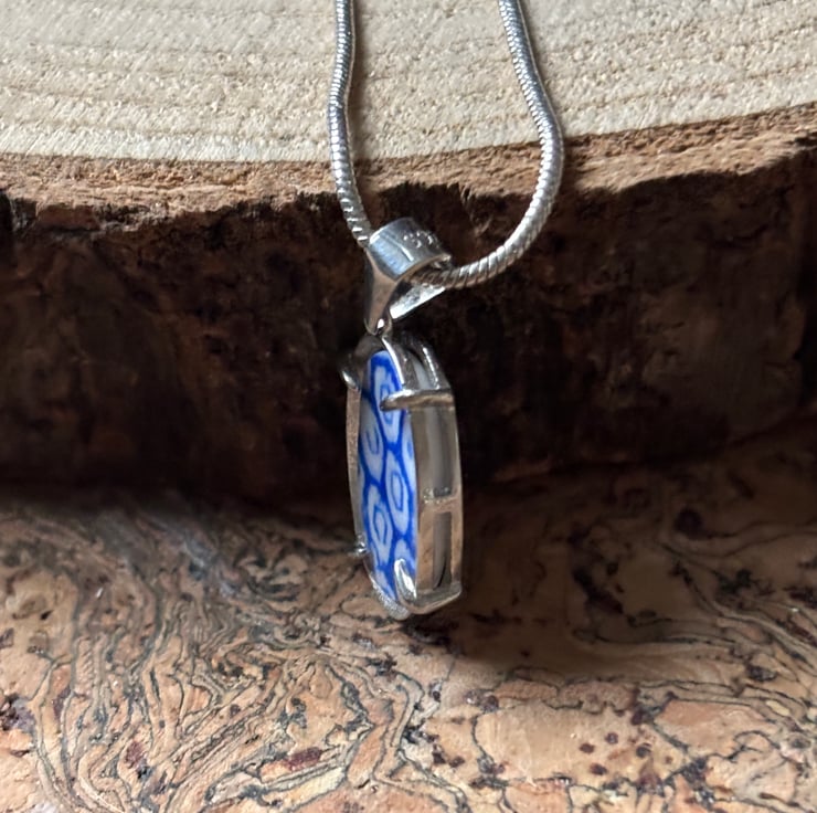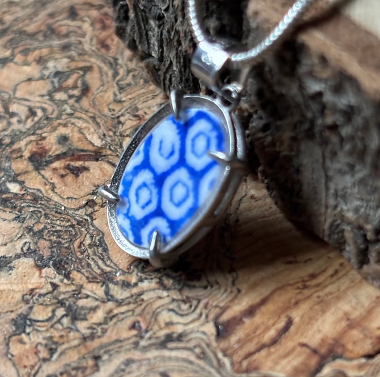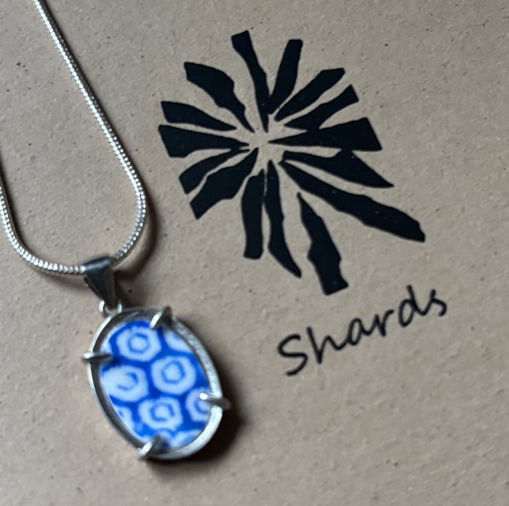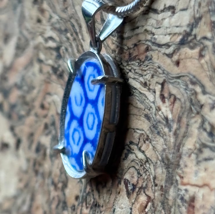 After a thorough clean, I gently clipped the piece to form random shapes. Sadly most of it broke but was left with one oval shape shard. Over a few days I sanded the piece and drilled a hole creating a pendant. However, there was a lot of damage around the hole so I continued to sand until it fitted into an open back claw bezel. Most of the glaze is intact and the front is slightly textured.