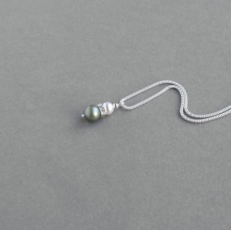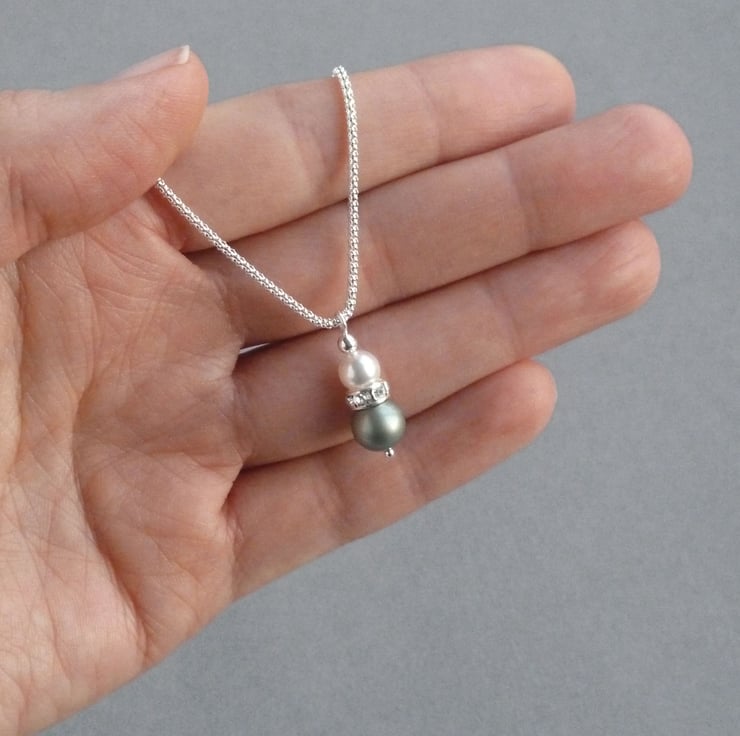 Created using powder green and white glass pearls and crowns of crystals, this dusty green pearl drop necklace would make the ideal gift for bridesmaids in a sage green or woodland themed wedding.