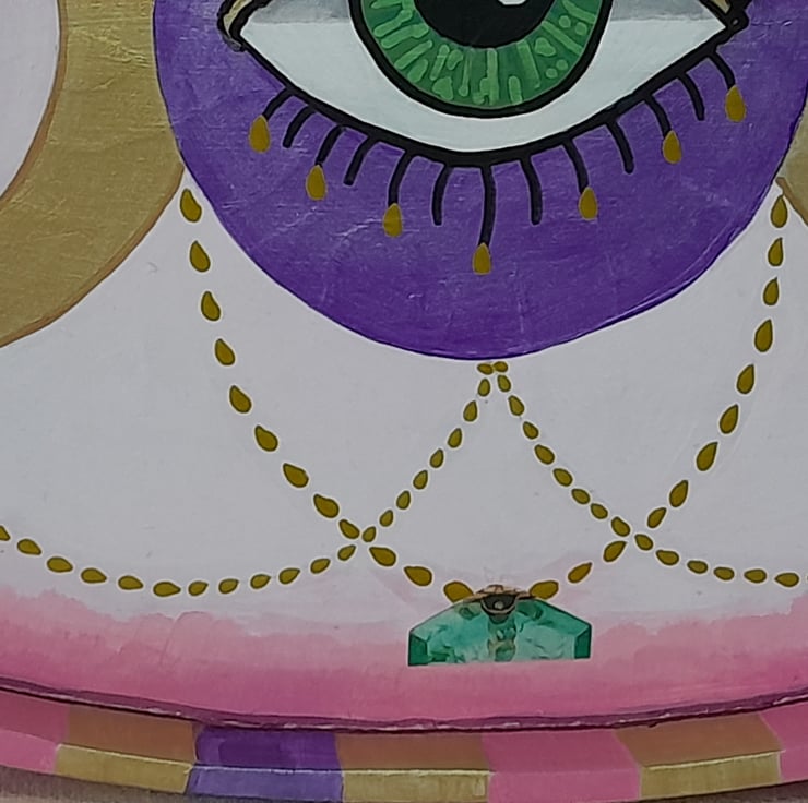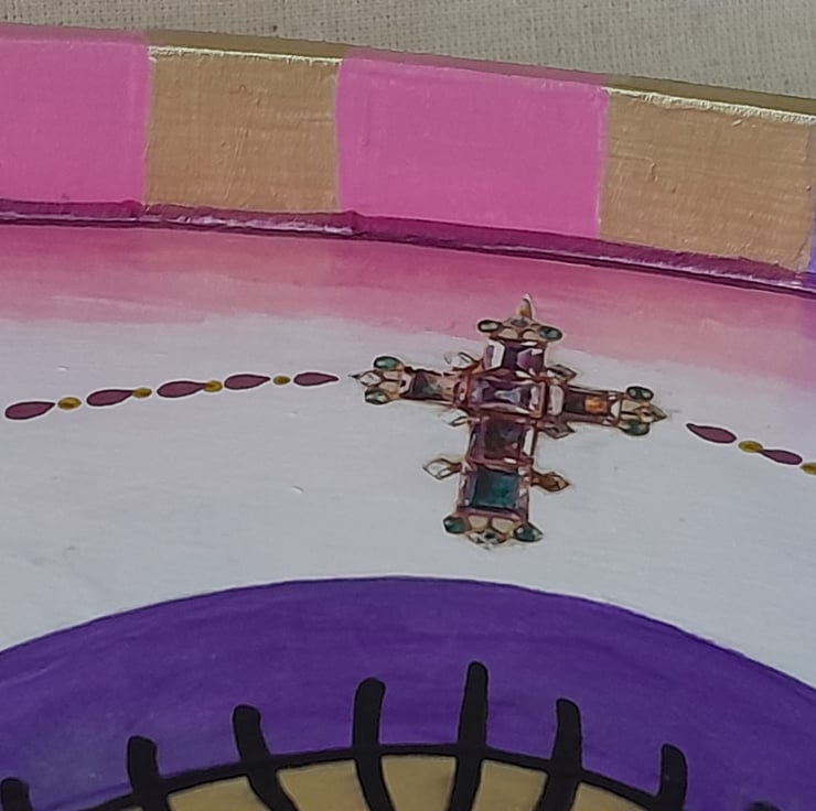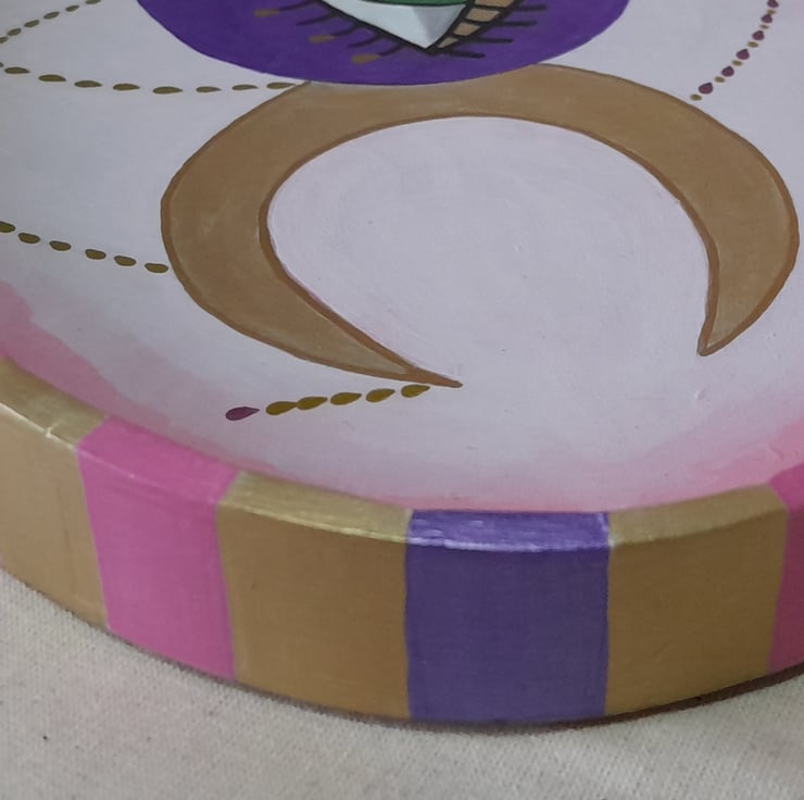 I found this worse for wear oval tray and loved the shape. It had marquetry and I followed the pattern by sectioning the colours as set by the old pattern. It called for the goddess moon symbol. I used purple, green and gold to reflect the suffrage of women.