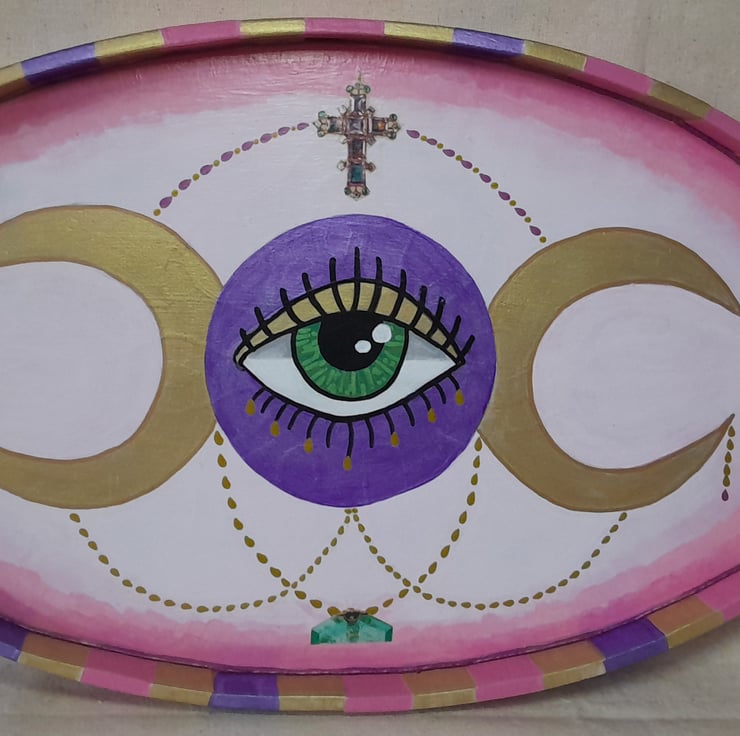 Triple Goddess moon on an old wooden oval tray. Featuring colours of gold, purple, green and pinks. They are linked with decoupage jewels and chains.