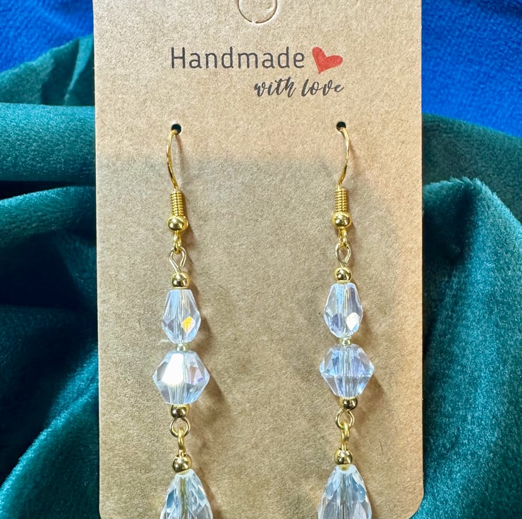 All of my jewellery is handmade in the Causeway coast area Northern Ireland, these earrings were inspired by my love of vintage cut stones. The gold tone shows off the unique old style cut of the glass beads.