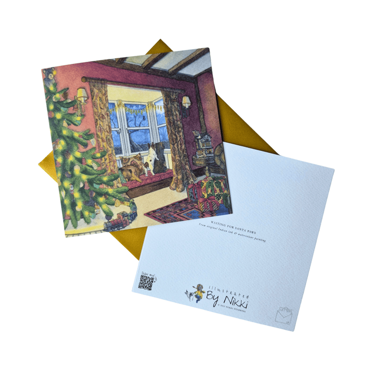 Send a little festive magic this season with my Waiting for Santa Paws Christmas cards. Each card features a print of my original ink and watercolour illustration, inspired by our old Thatched Cottage where Earl, Red, our mischievous Border Terriers, and Georgie Jack Rascal would perch by the bay window, waiting for something magical on Christmas Eve.