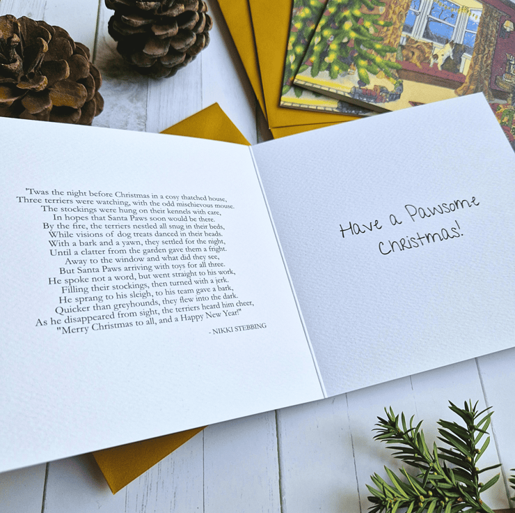 Inside, the right-hand side carries the cheerful message: “Have a Pawsome Christmas!” while the left-hand side includes my original festive poem, tailored from ’Twas the Night Before Christmas but with terriers and tail wags instead of reindeer and sleighs.