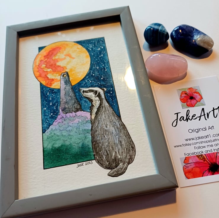 A beautiful badger gazing at a huge Hunter's Moon rising above a standing stone. This was all hand drawn by me using fine line pens and then painted with watercolours. It is in a slim grey frame measuring 12x17x1.5cm. It will be carefully wrapped in tissue paper and bubble wrap before being packed into a sturdy postal box. One only available.