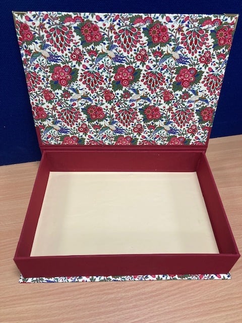 Stunning handmade box covered in Liberty bookcloth with contrasting plain bookcloth around the sides.