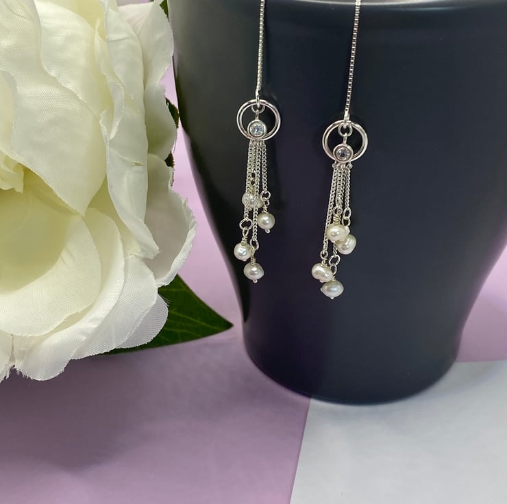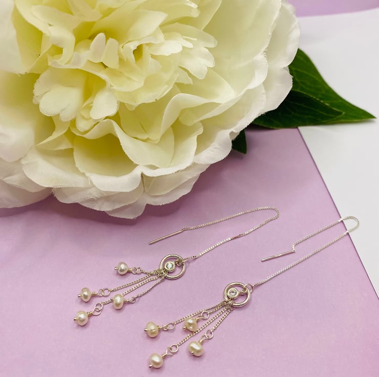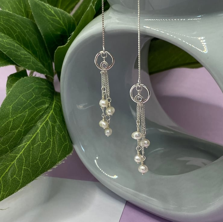 Total length of each earring is 12.5cm (earring post and chain measure 9cm, silver hoop and cascading pearls measure 3.5cm). The length can be pulled through and adjusted on each ear to be as long or short as you want on the back or front.
