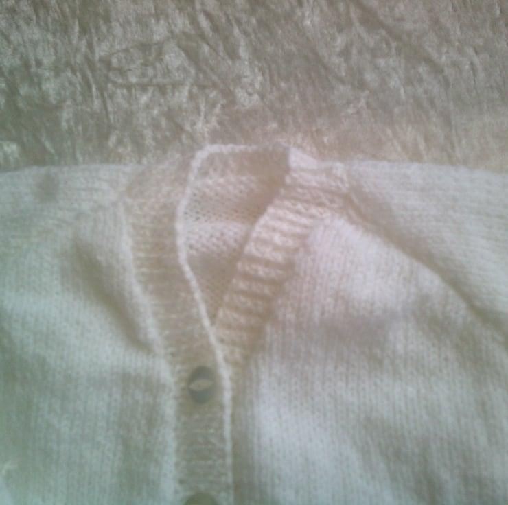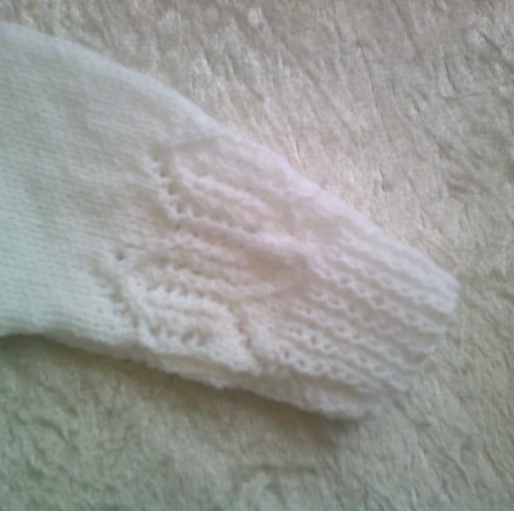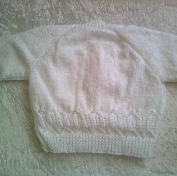 This hand knitted white yarn and has a lacy design on the fronts, back and on the bottom of the raglan sleeves. It would make an ideal addition to a child's wardrobe as it will go with a nice summer dress, party dress or even with trousers.