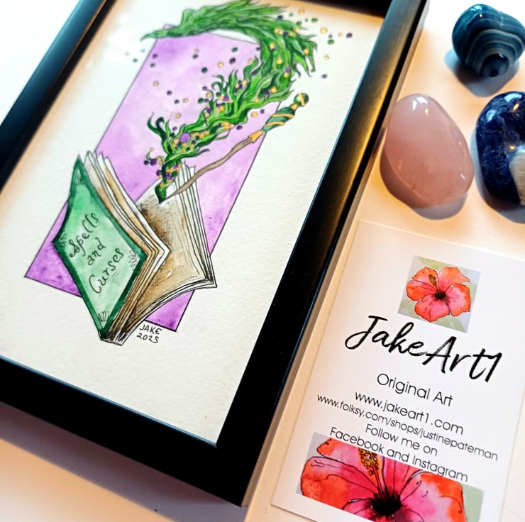 Open an Book of Spells and Potions and magic happens....hand drawn in fine line pens and painted with watercolours including gold highlights on aquarelle paper. It is in a slim black frame measuring 12x17x1.5cm. It will be carefully wrapped in tissue paper and bubble wrap before being packed into a sturdy protective postal box. One only available.