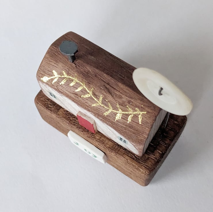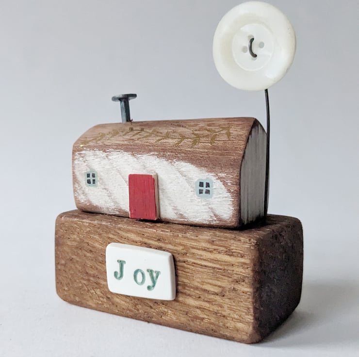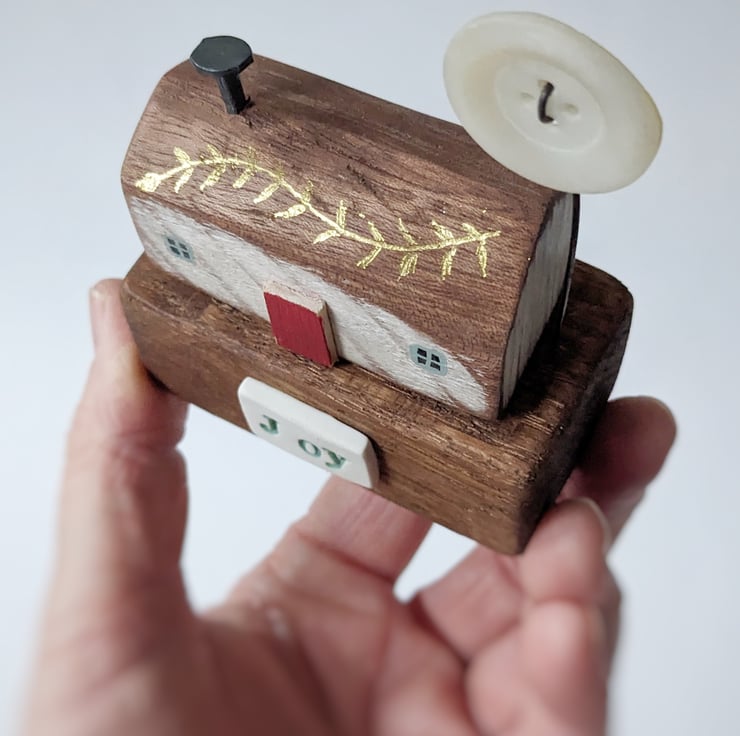 This is one of my tiny little houses, sitting on a lovely reclaimed wooden block. A pretty moon above and gold details make a joyful festive scene.
