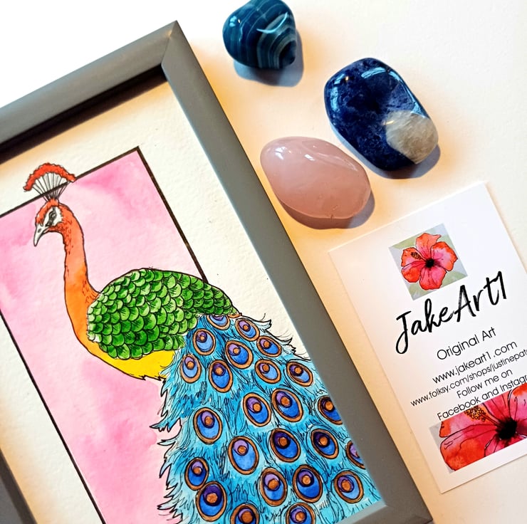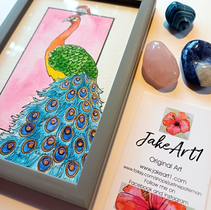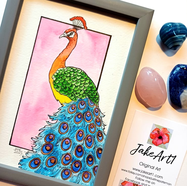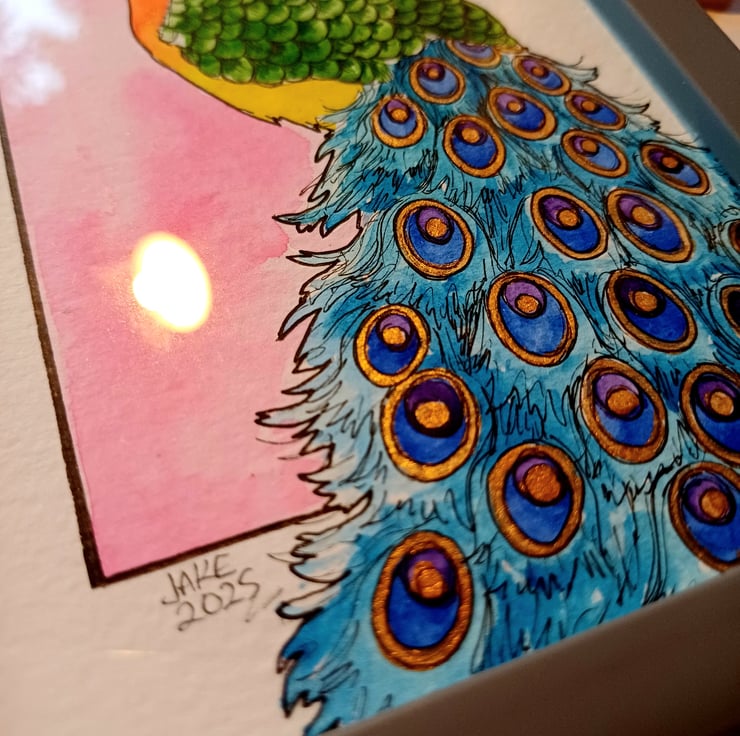 A colourful rainbow peacock hand drawn in fine line pens and painted with watercolours and a touch of gold on aquarelle paper. It is in a slim grey frame measuring 12x17x1.5cm. It will be carefully wrapped in tissue paper and bubble wrap before being packed into a sturdy protective postal box. One only available.