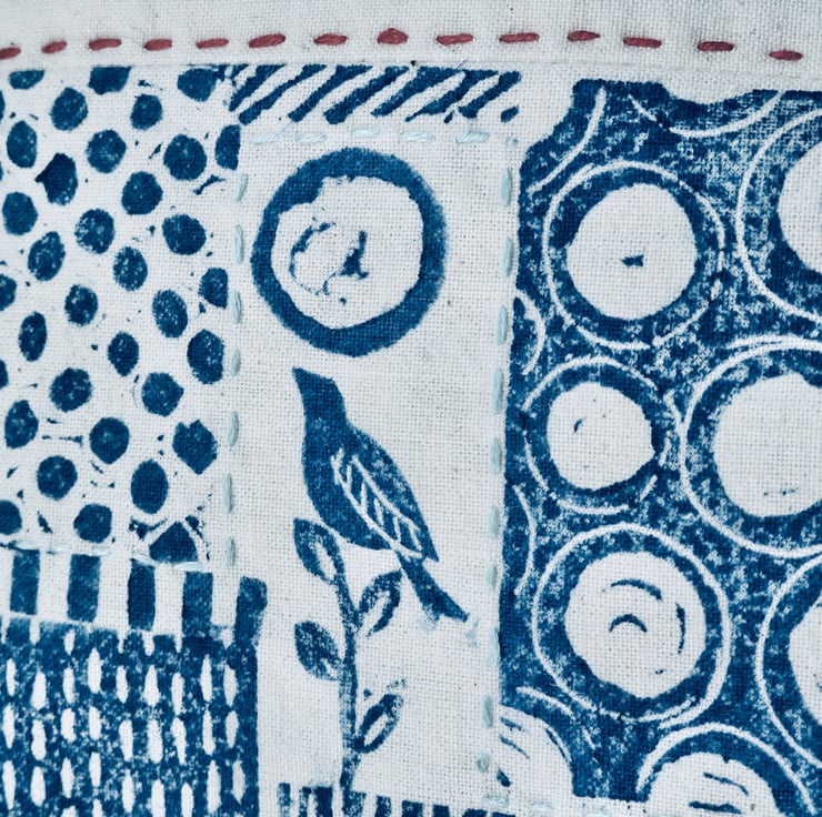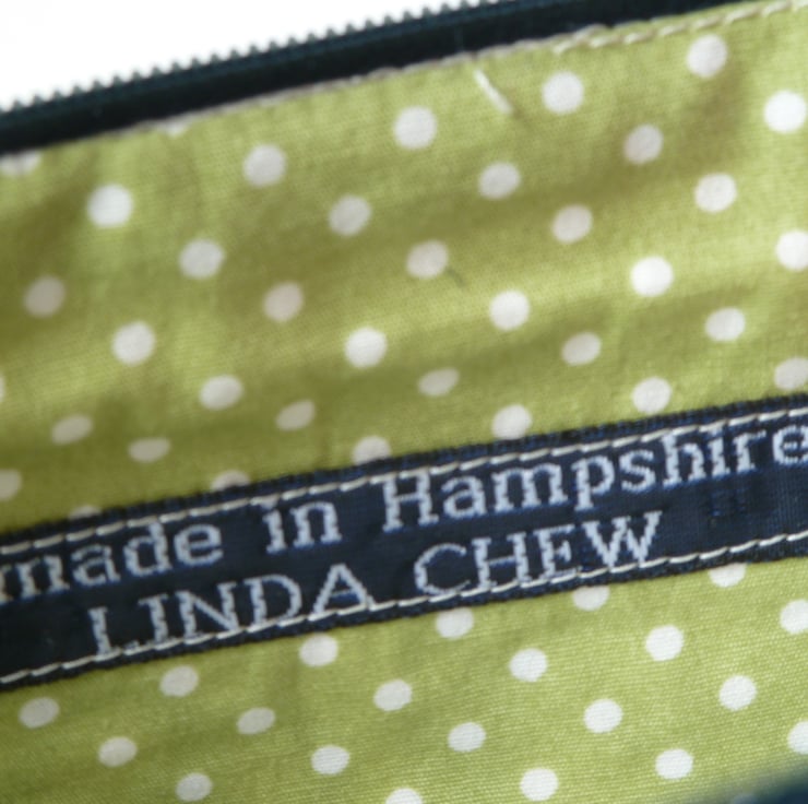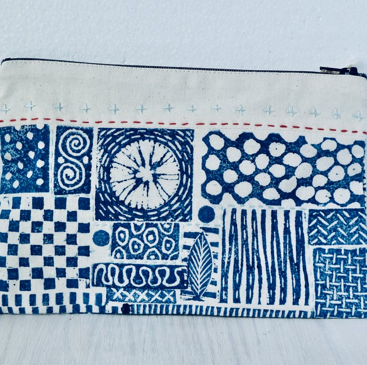 Based on patterns found on allotments,this handy lined pouch measures 20 x 14 cm. and It could be used to carry make up, pencils , charging cables , passport etc. it has been hand printed and embellished with coloured stitching. The lining is green spotted cotton