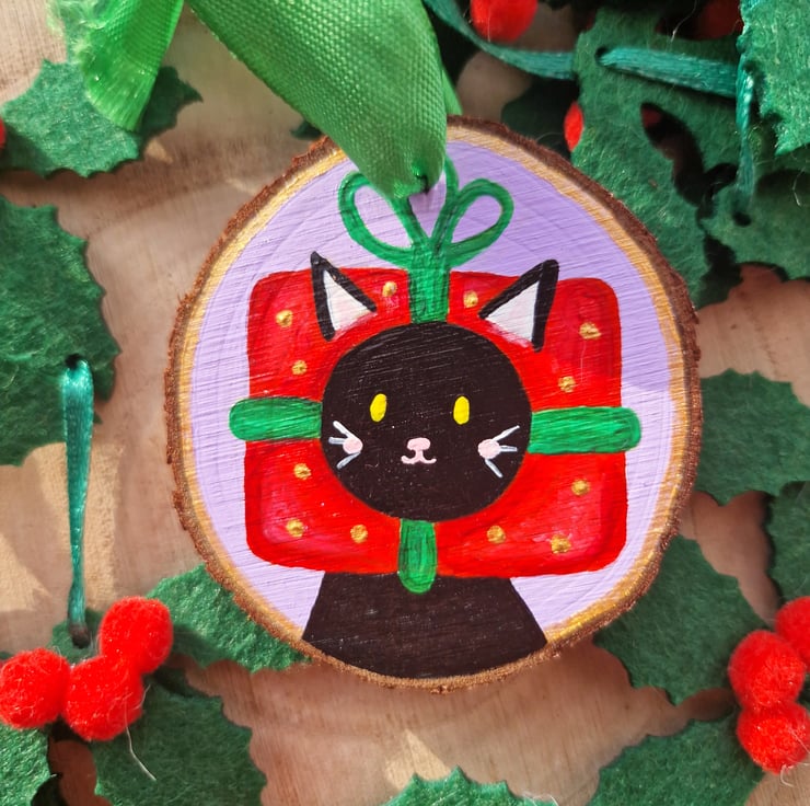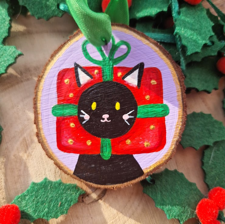 A black cat Christmas decoration that has been handpainted on wood slices. Finished with gold details, eco varnish and upcycled ribbon, these adorable hanging wood slice decorations make purrfect gifts for cat and Christmas lovers!