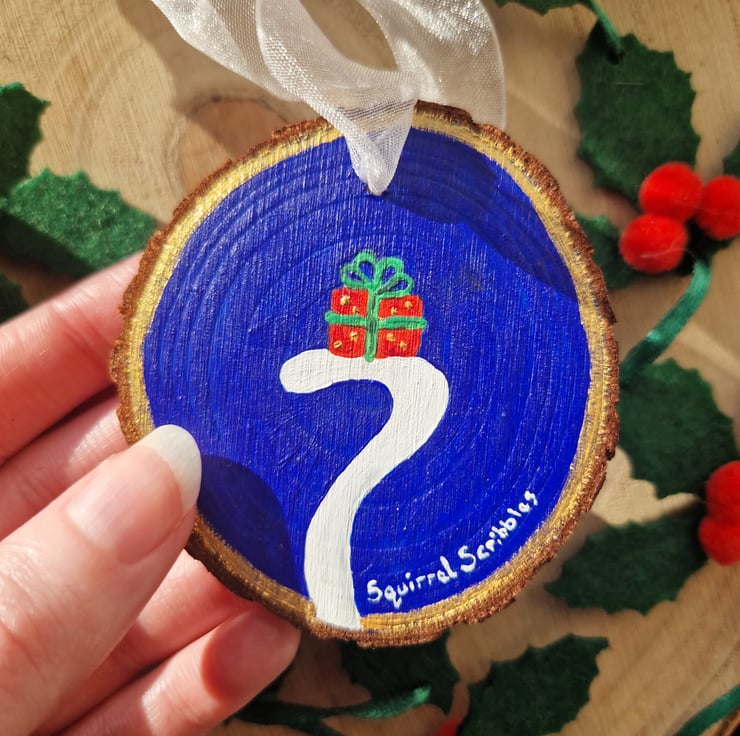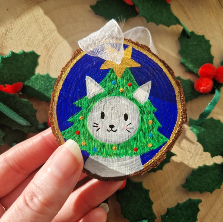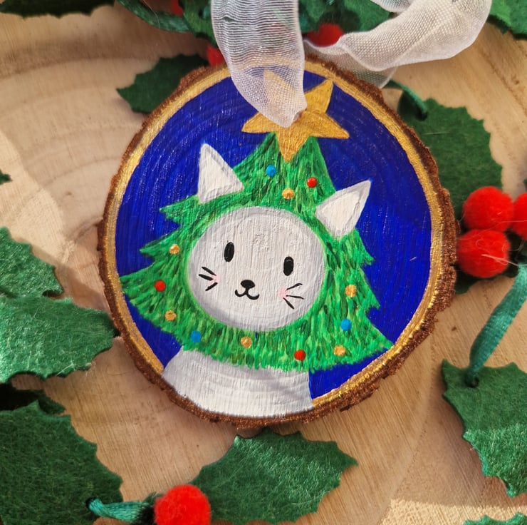 A grey cat Christmas decoration that has been handpainted on wood slices. Finished with gold details, eco varnish and upcycled ribbon, these adorable hanging wood slice decorations make purrfect gifts for cat and Christmas lovers!