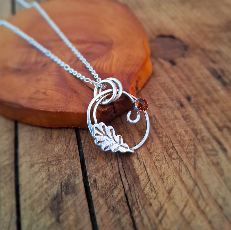 This oak leaf wreath pendant has a beautiful flowing dynamic with the wreaths symbolic meaning of continuity and the oak leaf expressing the strength and stability we need to keep going. Amber adds a touch of warmth & light to keep it all in balance.
