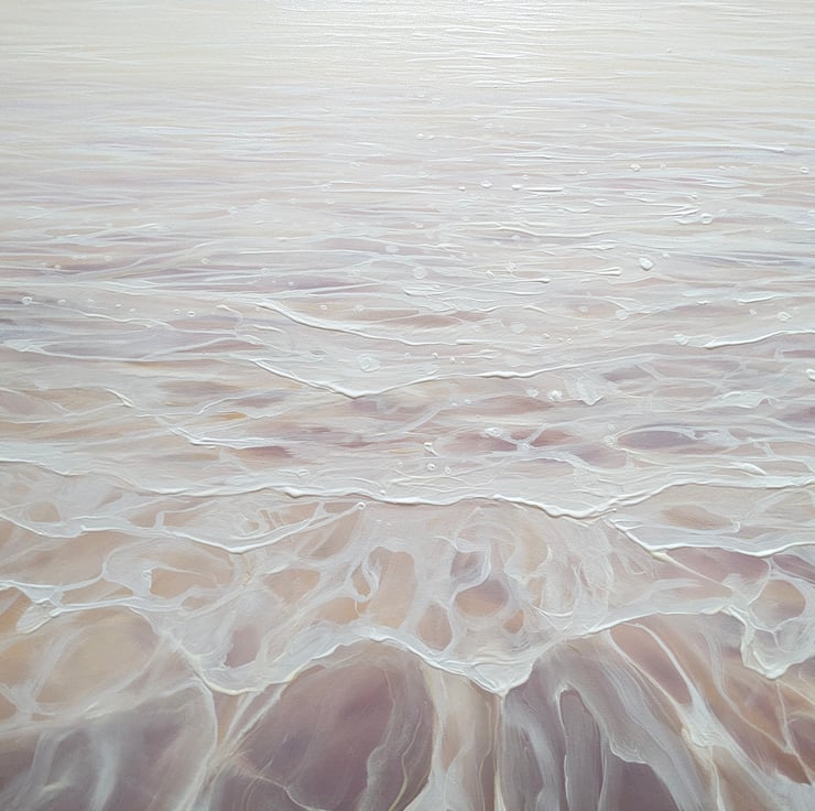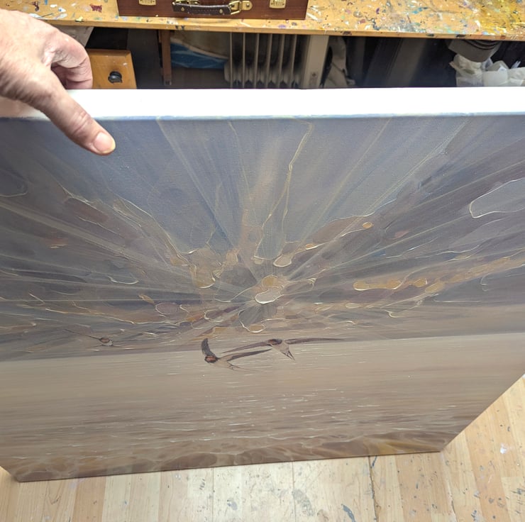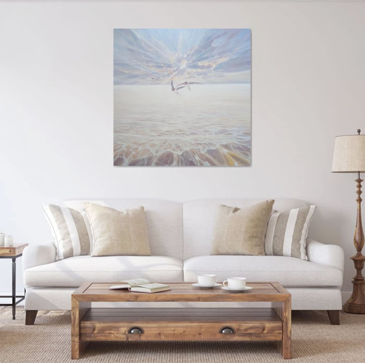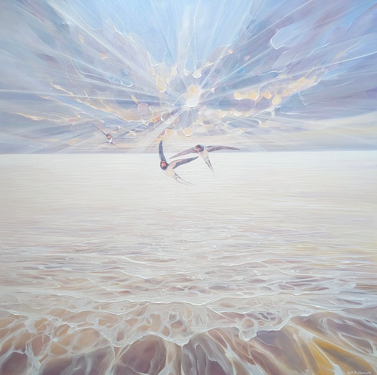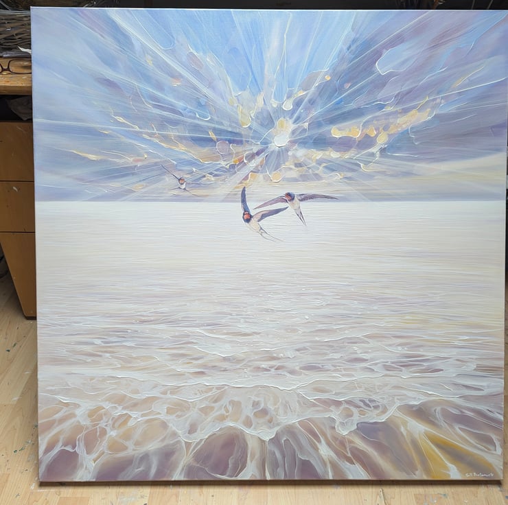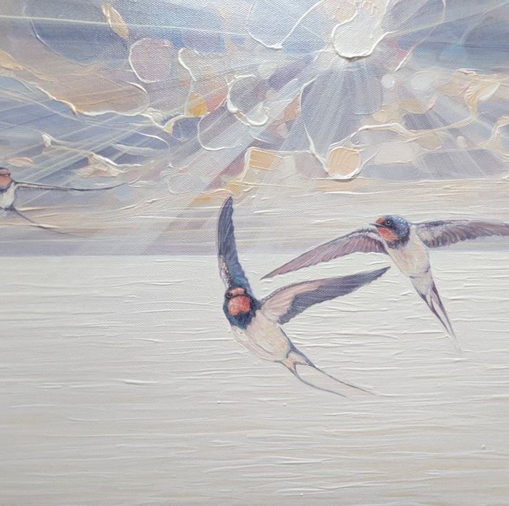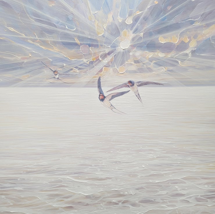 Beautiful Heralds is a large glowing seascape painting showing sun, sea and sky and arriving swallows. It is 40x40x1.5 inches. The three swallows are delicately painted in contrast to the beaming sun and clouds behind them and the waves rippling to the shore below them. This is another in series of tributes painted to my favourite birds - catching the moment they arrive from further south to make more swallows in the UK. It is a serene and joyous celebration of the continuation of life and the lengths that nature will go to simply survive. The colours are muted by liberal use of thick white paint but are mostly pale buttery yellow, light blue and lilac. The colours of the swallows reflect the colours seen in the sea and sky. Painted on deep edge canvas, edges white, ready to hang and comes with certificate of authenticity.