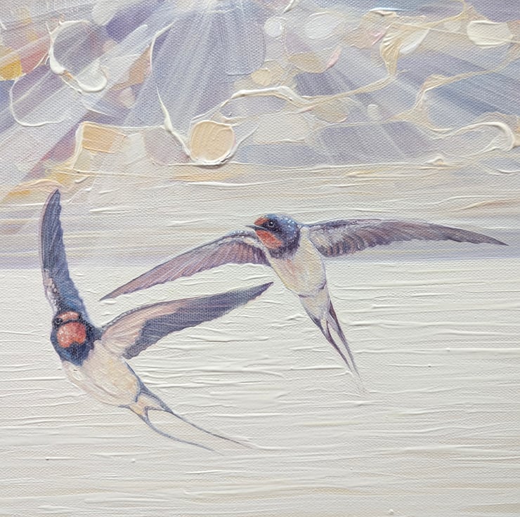 This is another in series of tributes painted to my favourite birds - catching the moment they arrive from further south to make more swallows in the UK.