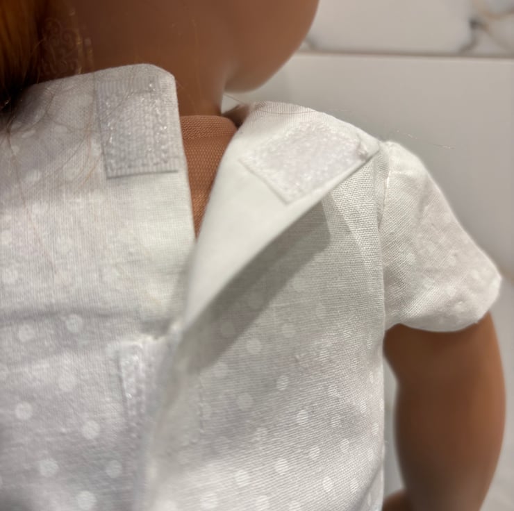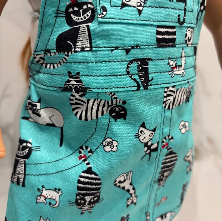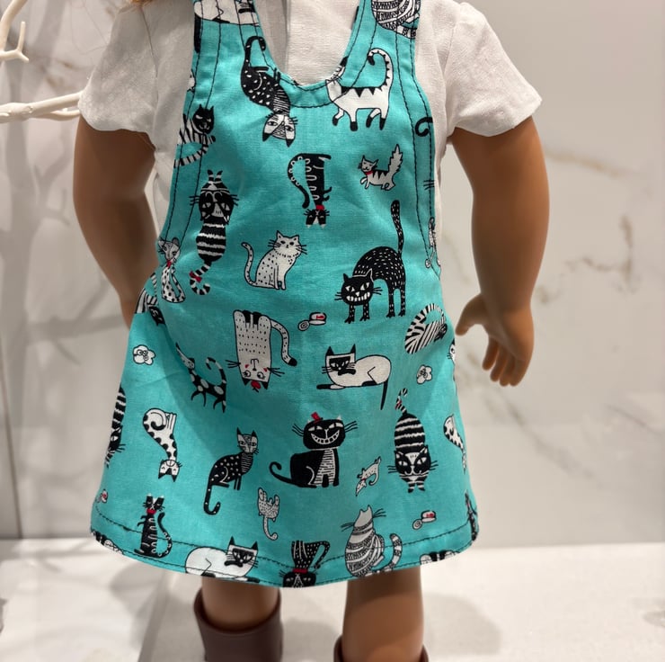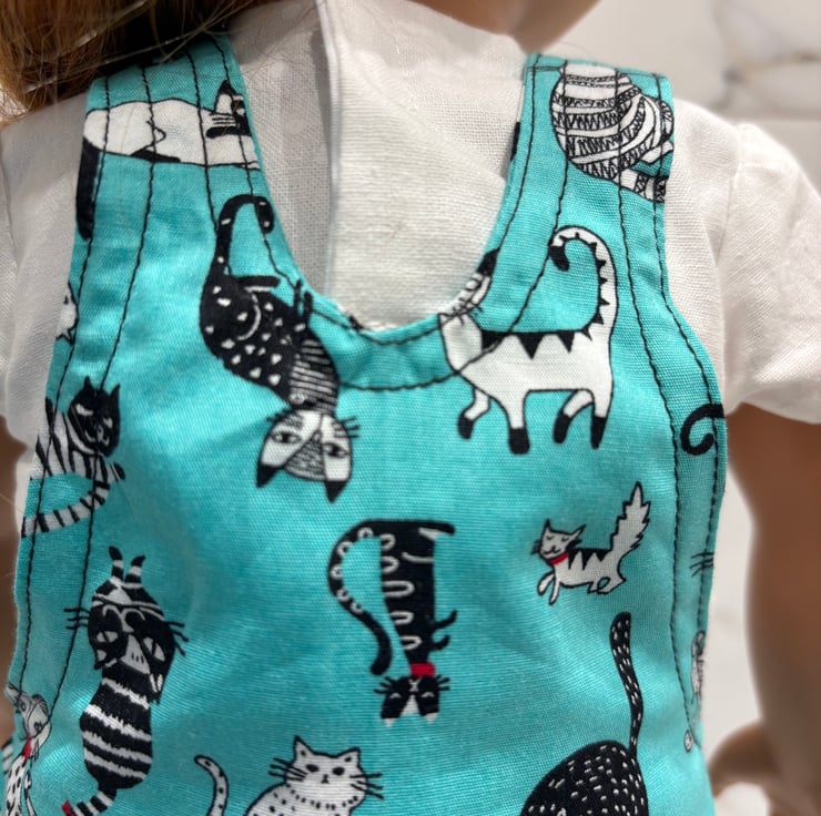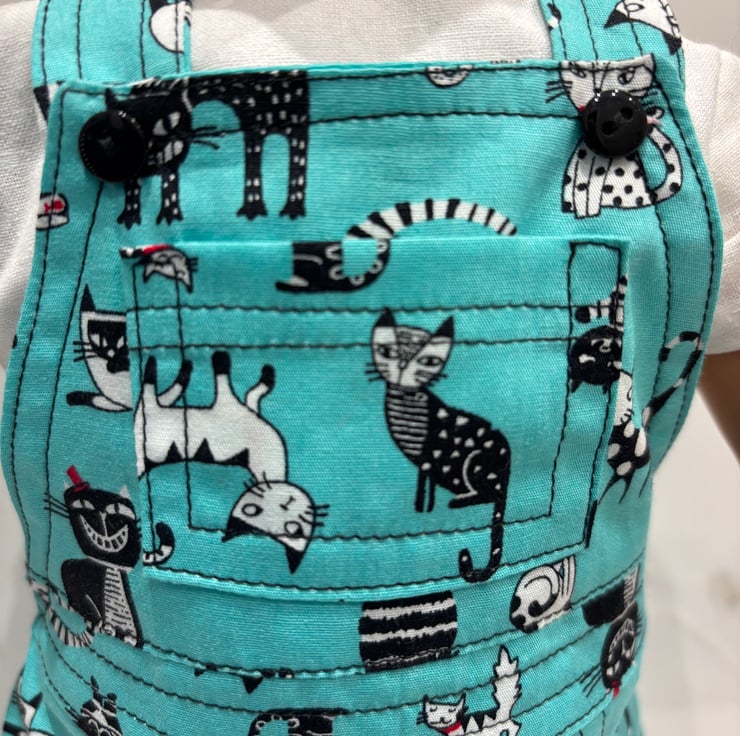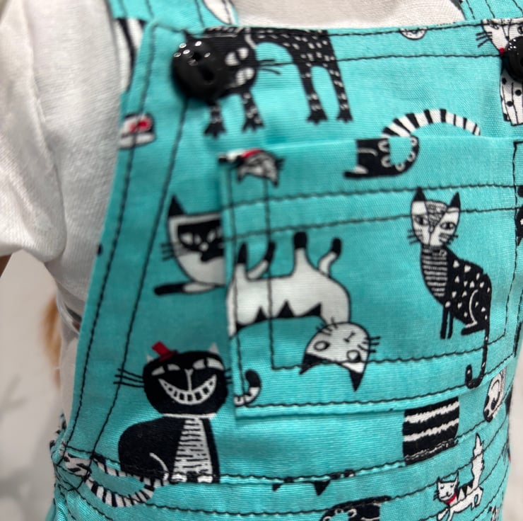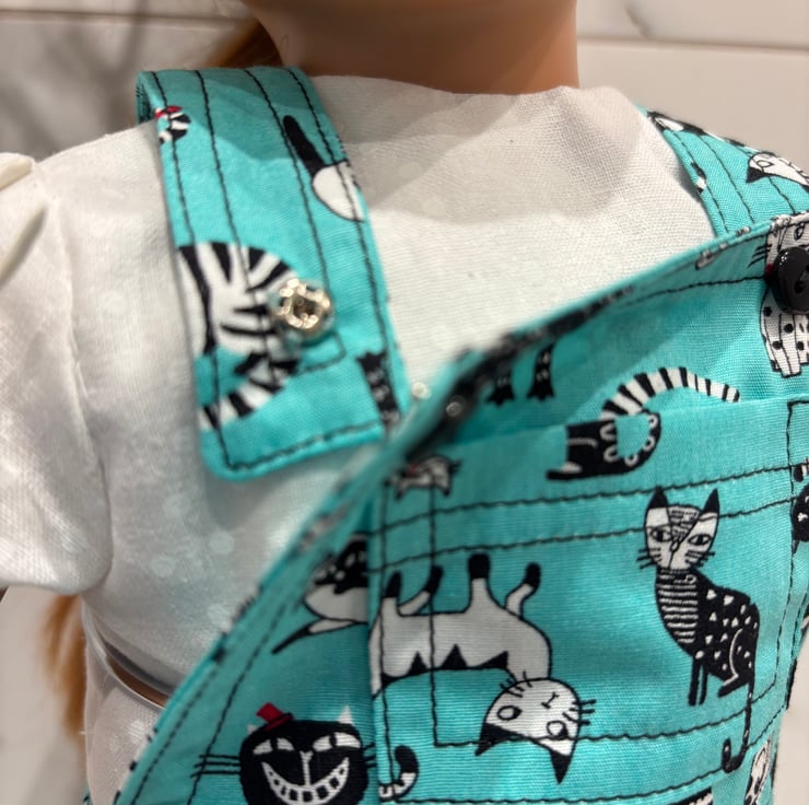 The pinafore has a lined bodice and opens at the front straps, with snap fasteners and dolly size buttons.