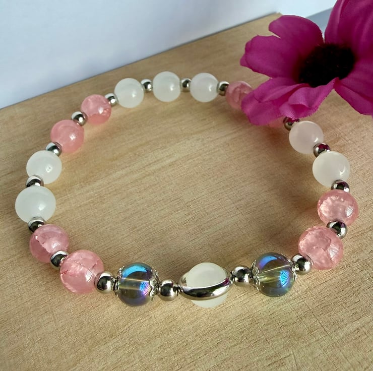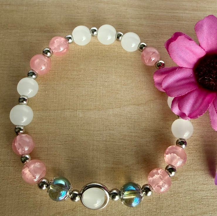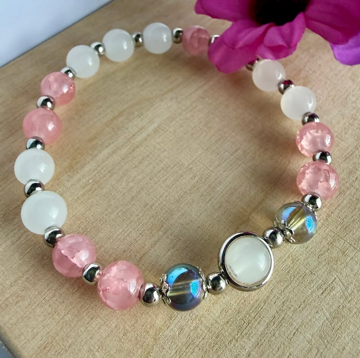 Stretch bracelet made using mainly delicate pink and white coloured glass beads. A central metal ring containing one white bead is hugged each side by lovely petrol effect coloured glass beads showing tones of blue.. green.. pink and purple amongst others. Silver plated spacers to finish. Would make a lovely gift for someone or a treat for yourself.