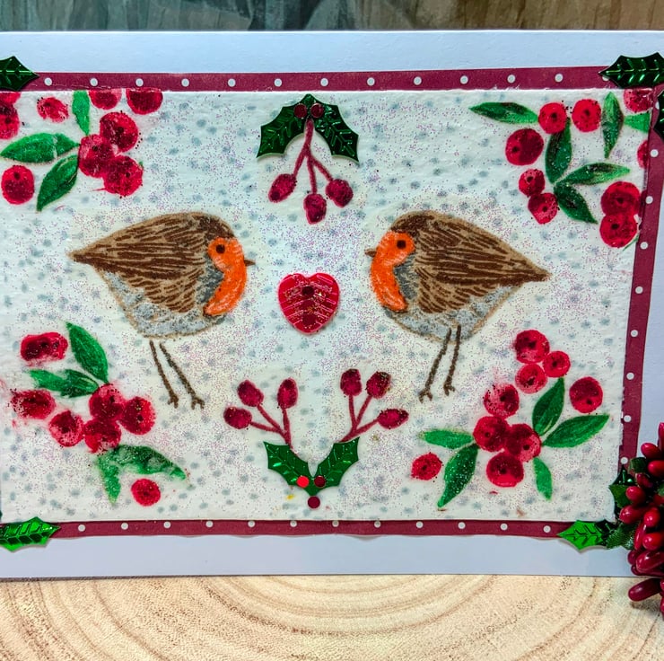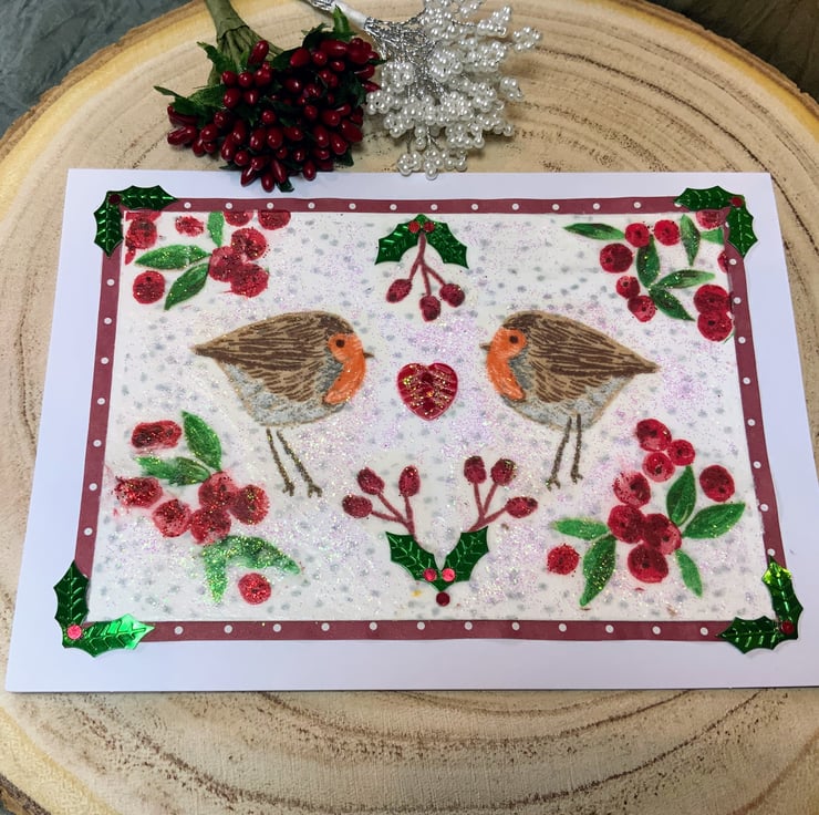 Two cute robins face each other with a love heart in the centre. Surrounded by holly and berries. Shiny holly leaf embellishments give shine and shimmer.