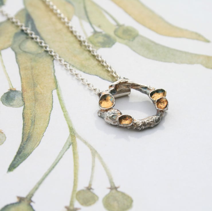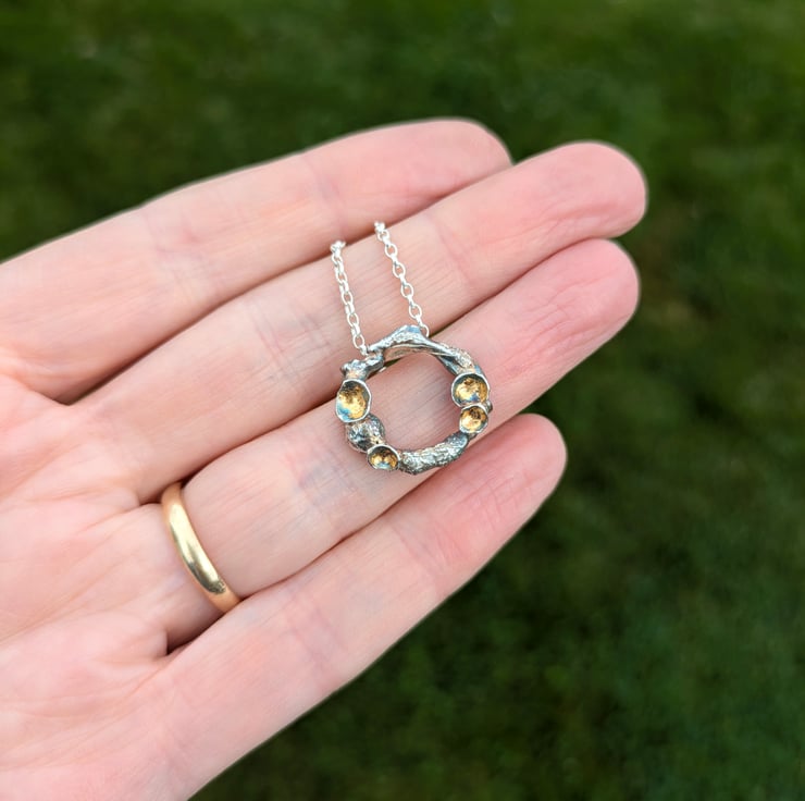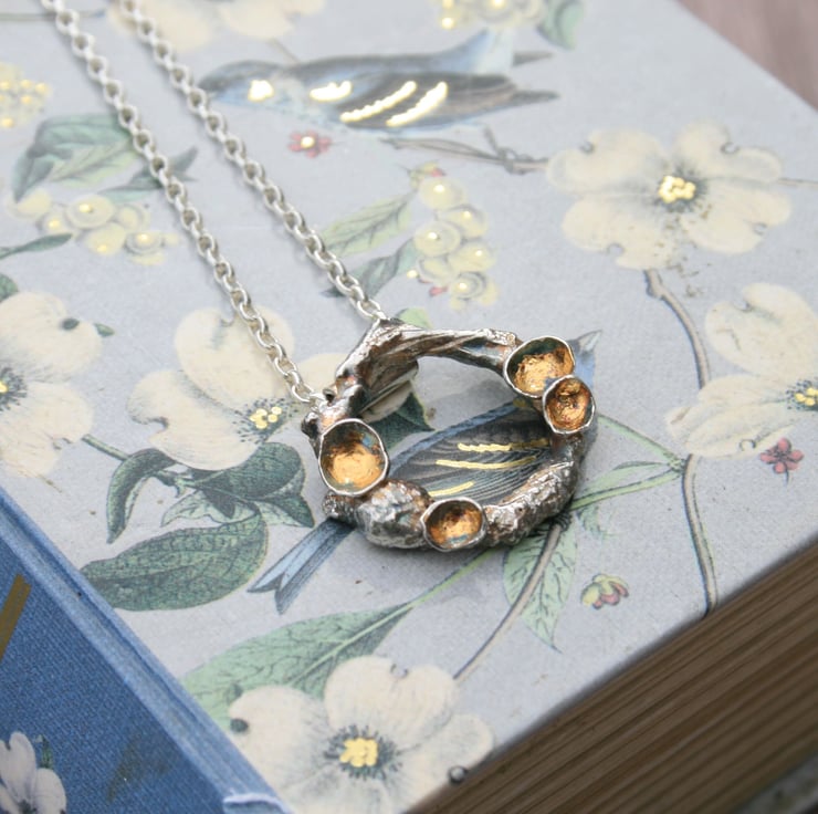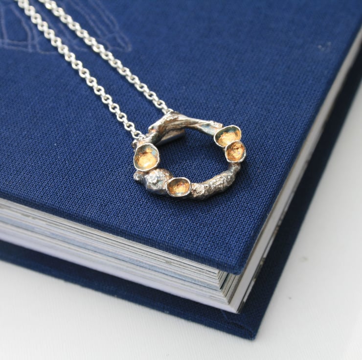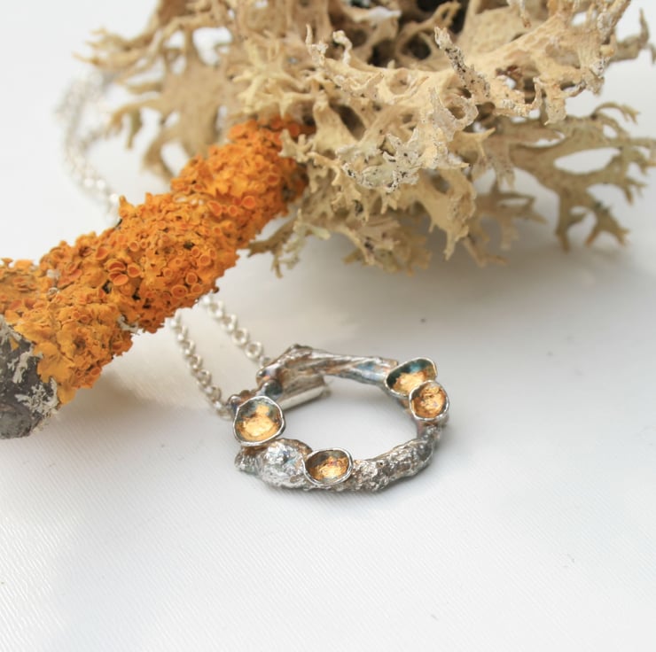 This delicate silver twig necklace is inspired by woodland lichen and handmade from recycled sterling silver. I melt down my leftover silver and form it into a small twig-like circle, then add tiny lichen shapes that nestle along the branch. It’s a lovely piece for anyone who loves nature, organic textures or unique handmade jewellery.