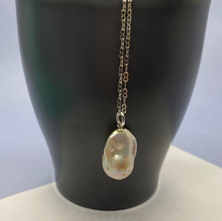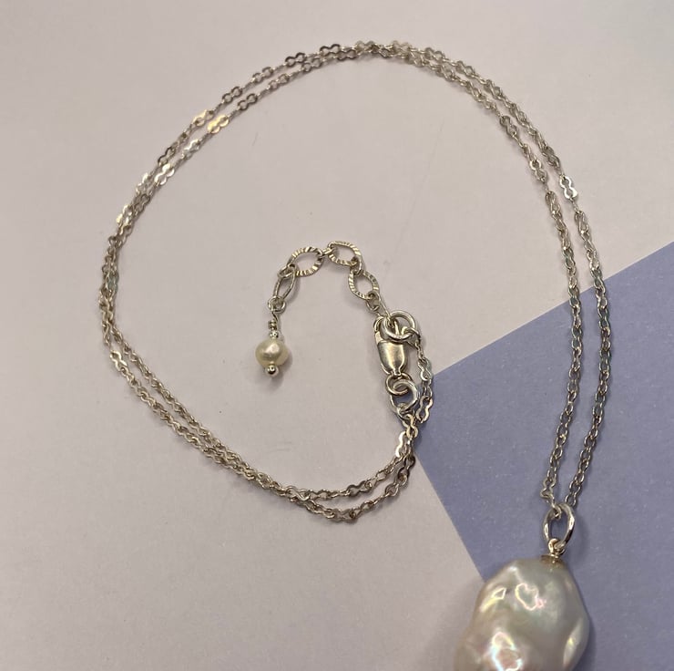 Here I've gone for simplicity to showcase this beautiful fireball baroque pearl (fireball is a nod to the tail-like shape of the nacre). The chain I've used is a figure of 8 in sterling silver, with matching sterling silver extender chain finished with a tiny cream coloured freshwater pearl.