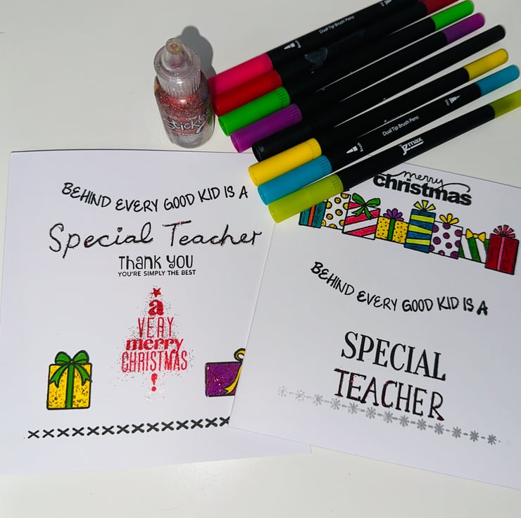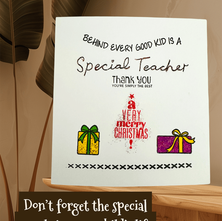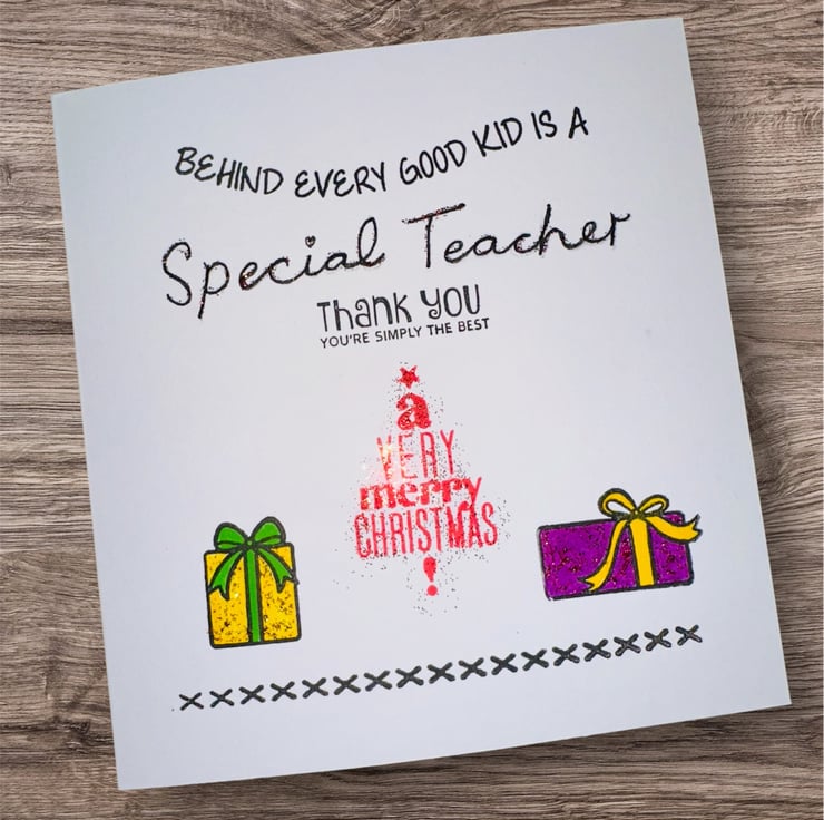 Share some festive joy with the mentors who shape young minds! This handmade card boasts colourful presents, a Christmas tree-shaped greeting, and a delicate sprinkle of glitter.