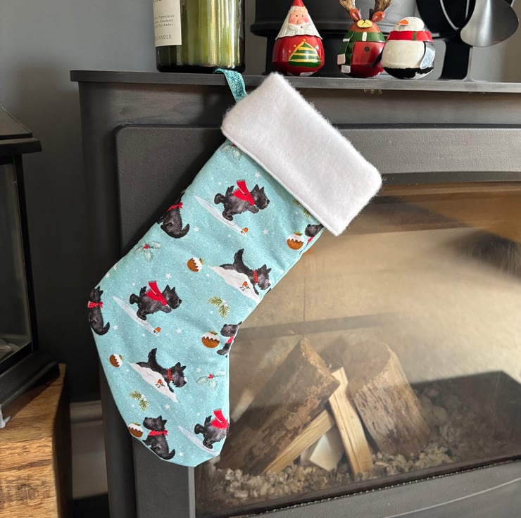 This cute Scotty Dog fabric makes a great Christmas stocking. It could be used as a decoration or to fill with small gifts for a loved one or a four-legged friend.